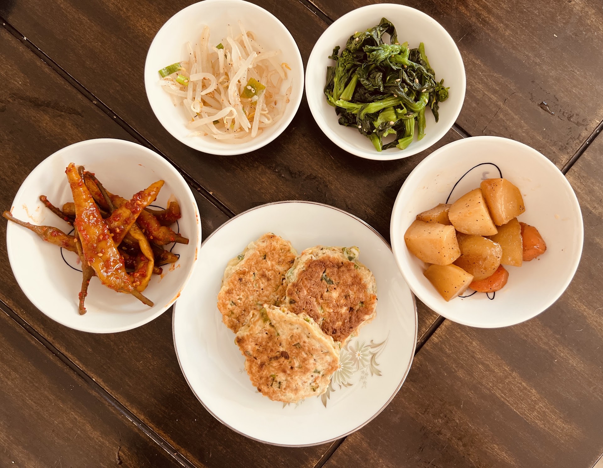 I bought fresh vegetable side dishes: spicy pickled radish/kimchi dish, sweet slightly hot potato--awesome, a crunchy mung bean dish, and a spinach with garlic dish.