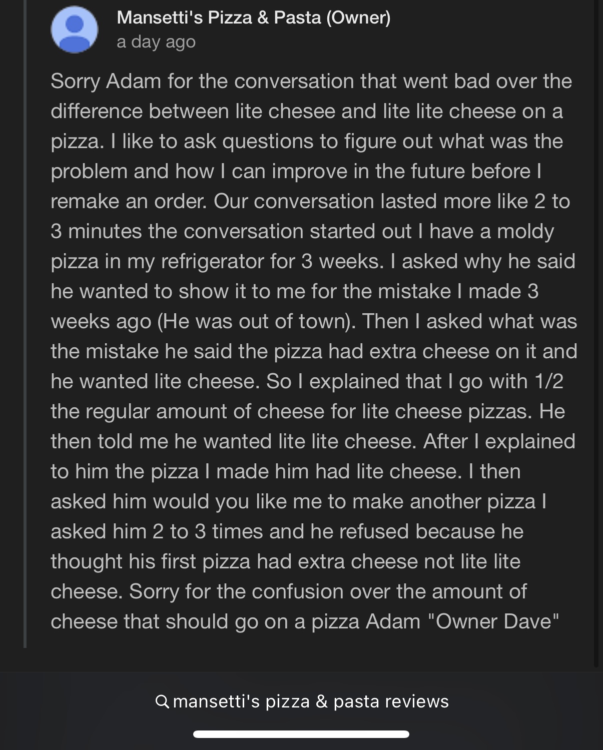 Read moreWouldn’t let me post two one star reviews, but as previously mentioned the owner is combative and unable to accept facts (terribly done pizza per instructions) or perceive critiques (hence the ill-informed reply to clearly stated issues) Dave should find a new career. If you didn’t make a pizza correctly and it’s causing this much commotion shouldn’t that be a sign that you’re the problem?
