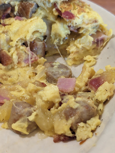 Corned beef hash was pretty darn good. Canned corned beef on top of hash browns with a dry no flavor scramble and over a coat of some type of cheese. Still good though and worth the price since there was so much of it.