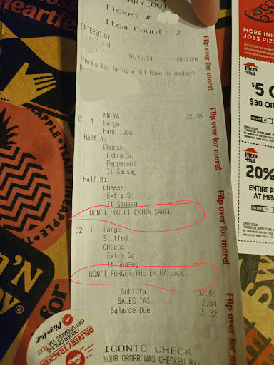 Update on 10/18/24 Back to the same ole same ole. Had to give this place 2 stars again because of the dry pizza, even after saying extra pizza sauce multiple times. I just don't understand. Then the person I spoke to says he watched them put extra sauce. Just take a look at the pictures I attached, dry as heck. I really dont understand. 2month update The new person who works there is so nice and she makes sure everything goes well with my order. So kind and professional. I like this place much more now. Original Review Pizza always delivers super fast, but they never ever ever give me my extra pizza sauce. I put it in the customizations and in the special instructions, and they ignore it completely every time. Actually, it seems like they put the smallest amount possible, and the pizza is soooo dry! App great - restaurant terrible. I put extra pizza sauce, and they rarely put it on there. Actually, it seems like they make sure to put less sauce. I have to call the restaurant (every single time I order) and ask them to please put extra sauce on the pizza. And sometimes, they STILL don't do it. It's the most frustrating thing ever, and no one seems to care, and no one seems to try to reach out to me to find a solution. It's...