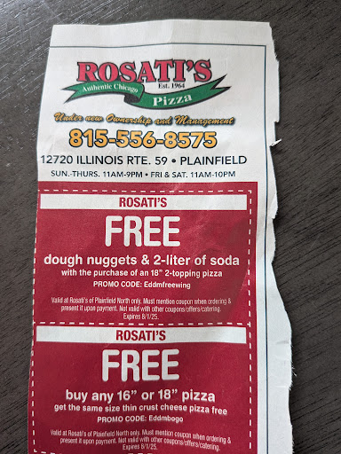 Read moreI order from the Shorewood IL Rosatis quite often, and it's always very tasty. Tonight I picked up my free 16 inch two topping pizza, but in reality I paid for it it's just I had a free pizza on my account that I hadn't picked up just yet. The pizza was burnt and extremely well done, the cheese on every slice was dark brown, almost black. I never order any pizza well done, just normal so it's not like I ordered well done and they over did it on accident. Anyway, it was so overcooked every bite you took I had to wipe the flying crumbs off of me because the crust was cracking everywhere. Needless to say after 2 pieces I wanted nothing else to do with the rest of the 16". I feel like I got this carelessness because today I didn't have a charge to pay which is totally unfair because I paid for the pizza prior but didn't get it so I had a free one added to my account.. I hope management sees this...