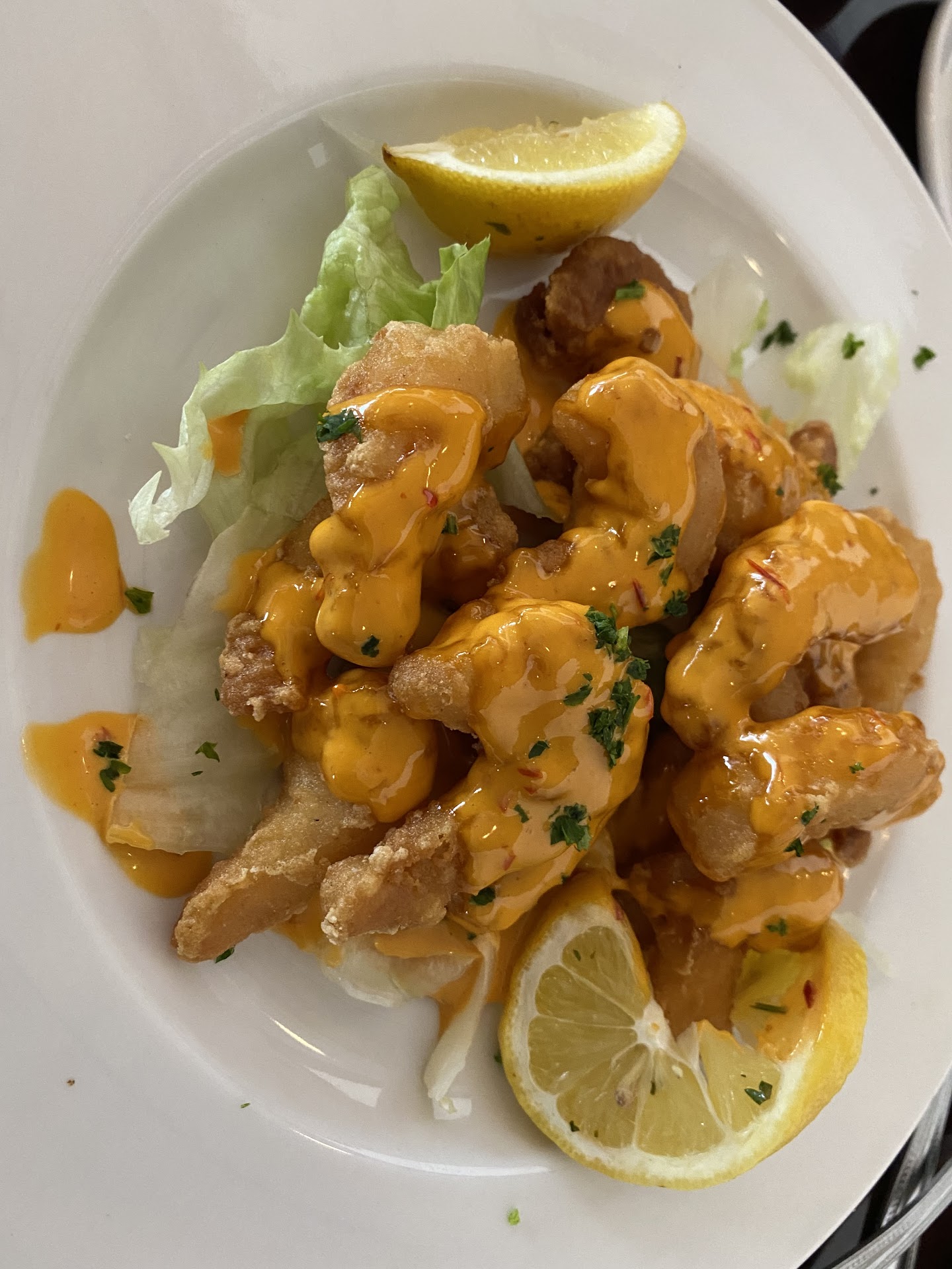 We ordered calamari, Spanakopita and boom boom shrimp for starter.. boom boom shrimp is a poor knock of version of bonefish grill bang bang shrimp.. we didnât like the taste of the sauce.. calamari was good but the quantity was less compared to other places that serves the same appetizer.. Spnakopita was good..