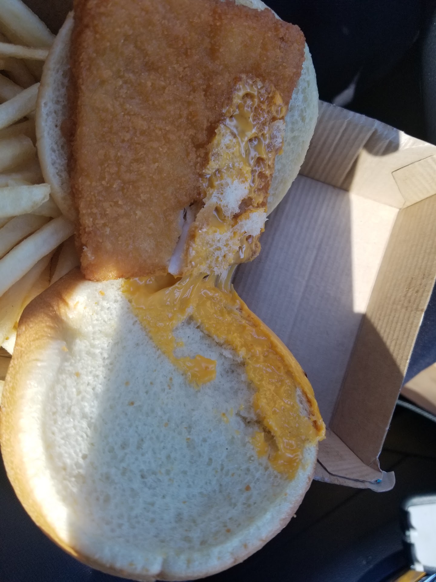 Read moreStopped here on the way back from Destin, FL yesterday. I must say I was little disappointed. I think it's several reason why we are not getting quality of service from pre-pandemic. Most places are understaffed, and the staff they have are either not trained well enough, or they are just trying to get anybody to come to work. With the being said We went inside and ordered a 6 piece nugget meal with sweet and sour sauce, and a fish filet with no tarter sauce, and no salt on the fries to go. We got the order, no sauce was in the back or ketchup. Get to the car, and the fish filet had tarter sauce on it. I took it back in, and the guy that took it from me told them to drop a new fish filet, and told me it would be about 2 minutes. But another worker brings me the one I guess that should have been given to me in the first place. When I got it, it seems the slice of cheese was placed at the edge. I used to work at McDonald's, and normally on the fish filet, it's a half of piece of cheese in the center. As you can see in the picture that was not the case. Please train the workers better, and encourage them to have pride in their work. When I used to work at McDonald's the minimum wage was like $3.75, but I never would let no customer get anything like this. I'm not going to give a bad rating, as I think this...