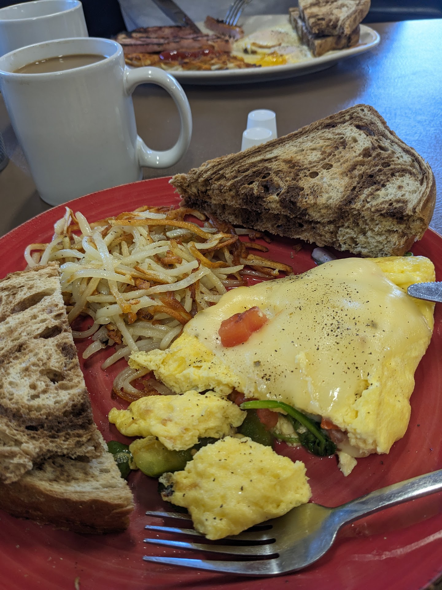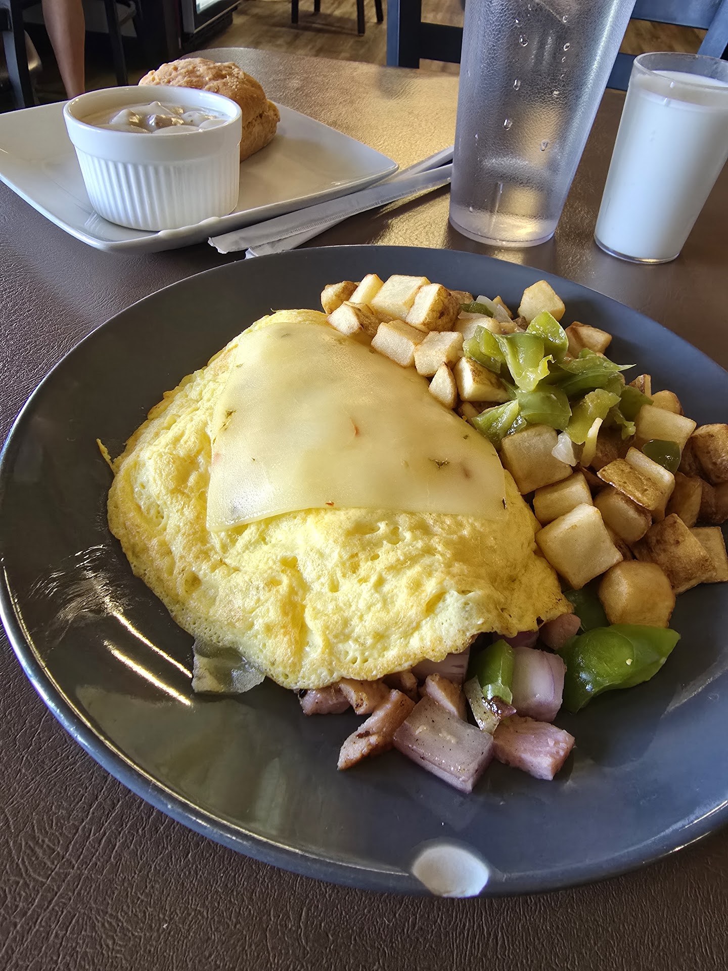 Potatoes that previous reviewers raved about with onions and peppers, had neither, they were frozen Ore-Ida style diced Potatoes, they did however have syrup on/in them which was not really the bonus you would think it'd be. We are not sure if the meal was plated on a dirty plate that had syrup on it, or if it was poured on before the "frozen" potatoes were placed on the plate, either way it was rather nasty.
