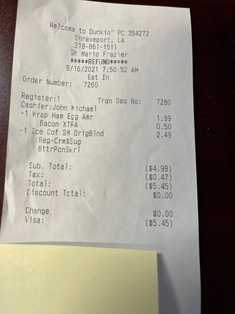 Read moreI ordered online like I always do on 10/25/23 and I when I got to the window I noticed my drink was wrong. I immediately said that doesn’t look right it was almost black(I ordered it with almond milk and sweet cream foam) she said no it’s right that’s why it looks like that. She hands it to me and I see no sweet cream foam and I hand it back to her the employee literally huffed and puffed like a 2 yr old. Then the lady I’m guessing maybe manager was standing right there and I said I would like a refund the first employee I was dealing with walked away and the maybe manager come over and asked how can I help you. I had to explain it all over( she was standing right by the employee while I was telling her what was wrong. I told her I wanted a refund she told me she had to scan the QR code for my refund and I then asked for a number to call and make my complaint she told me I don’t have a number. So I got to work and googled Dunkin’ and found a number come to find out the lady never issued me a refund because apparently you have to call the 1800 number for refunds when it was a mobile order per Susan on the 800 number. I will NEVER NEVER COME BACK. I have got to this locations many of times and their customer service hasn’t been great but I kept giving them a chance but nope not this time. I am over 10 employees and I would never allow this to happen at any of my offices.