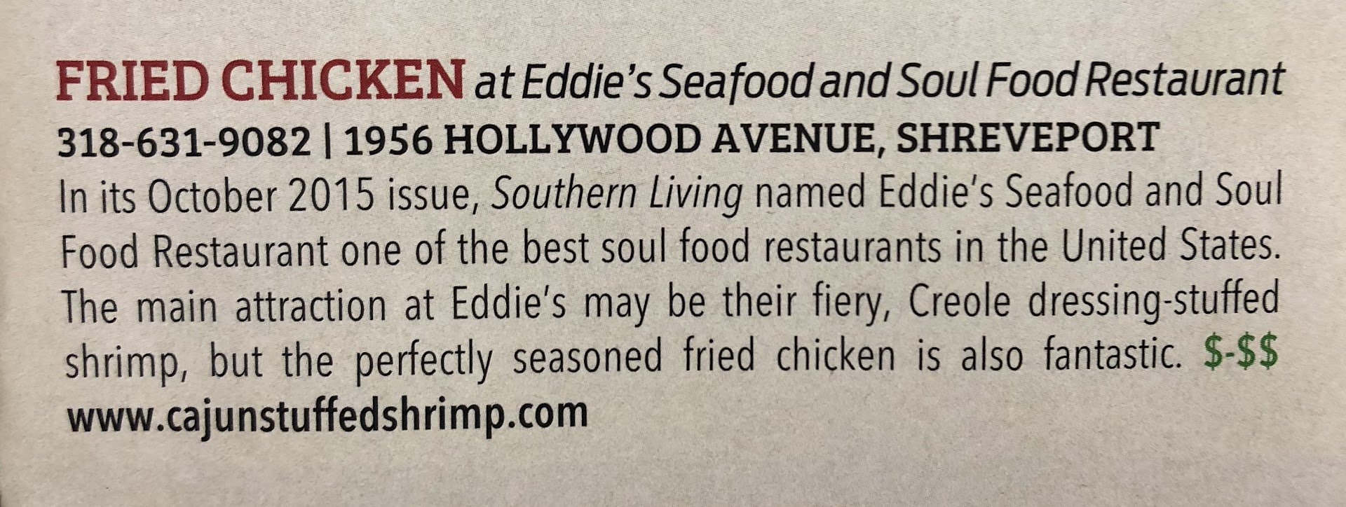 TODAY MY EYES WERE OPEN AND MY TASTE BUDS WERE TANTALIZED... YOU want the best seafood with a great price & great ambience that's full of Flavor, WELL COME ON DOWN To EDDIE'S...Here in Shreveport Louisiana, where the service is impeccable and the staff is so friendly and will recommend great dishes especially their FAMOUS STUFFED SHRIMP, OH my goodness, when I say EDDIE'S food is delicious, it is, our food came in a timely fashion, nothing was over/or undercooked. And the dessert.OMG, the peach cobbler was so good, it'll make you want to slap your mama, that's how good the food is and the staff was amazing & full of hospitality, & they'll make you laugh even if you're having a bad day, this is the place you would want to be to get catered to while having an enjoyable family meal. & EDDIE'S desserts are to die for, they had the best homemade fish sandwich was delicious no soggy fries and the tartar sauce which was homemade is delicious as well. The atmosphere alone will take you away on a ship cruise if you think about it, all are in togetherness, with the best seafood in town, order Eddie's famous stuffed shrimp delicious 🤤 you can't go wrong if you're coming here for enjoyable family-friendly atmosphere that'll make you want to come back and enjoy dinner here again as I look forward to again. We really enjoyed...