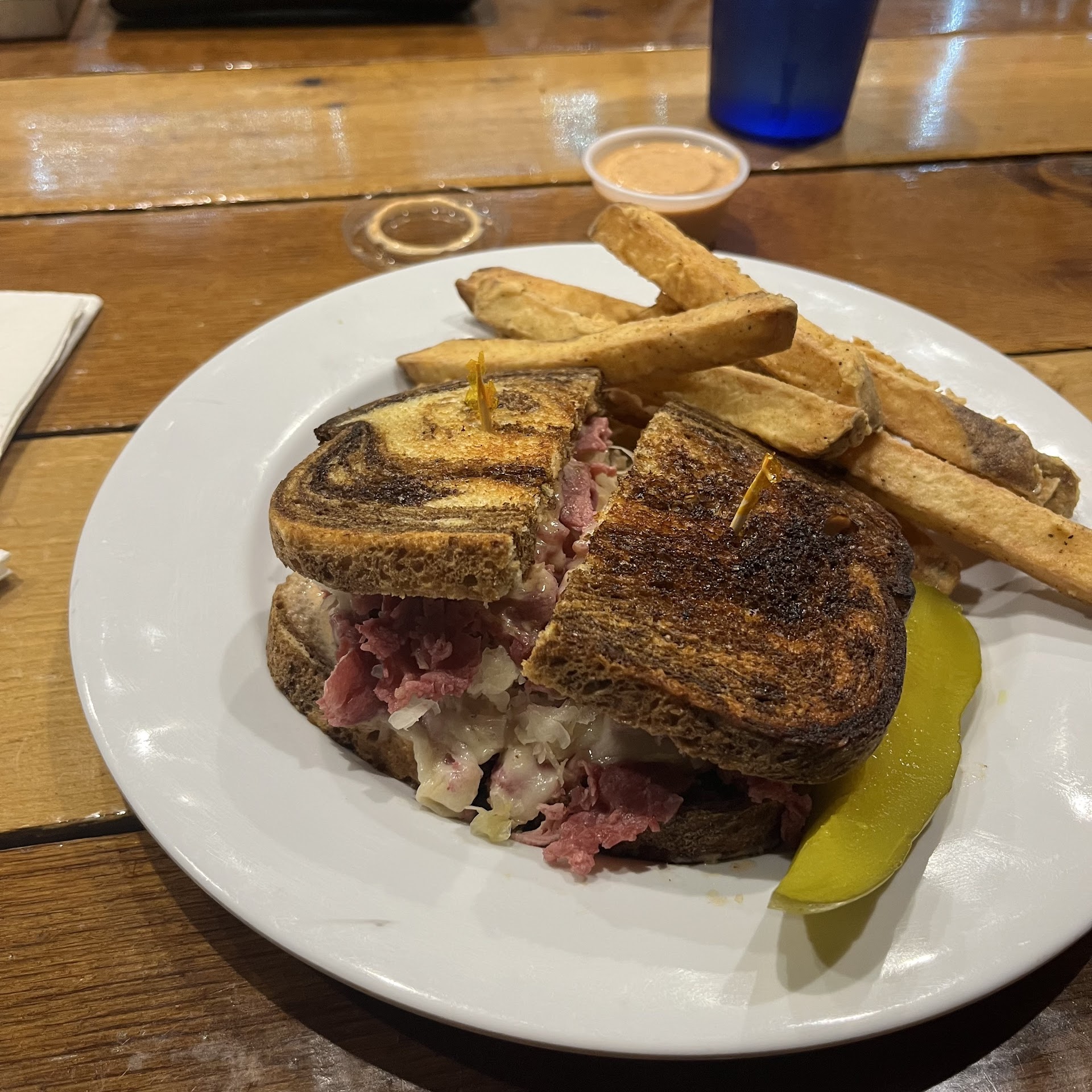 Read moreSUCH a cute little building to shop and eat in. I think about their chicken salad and all the ways they serve it, every single day. It's such a good savory chicken salad, and I love buying some to take home. The sandwiches all come on fantastic bread - the sourdough and the jalapeno are the favorite in my household. My husband and I just got take out and couldn't be more pleased with our meal. His club sandwich is made with thick cut, high-quality deli meat and my Cuban sandwich is absolutely perfect. They do some sort of batter or breading on their fries, which are huge, and we can't get enough of them. Tangy fry sauce...