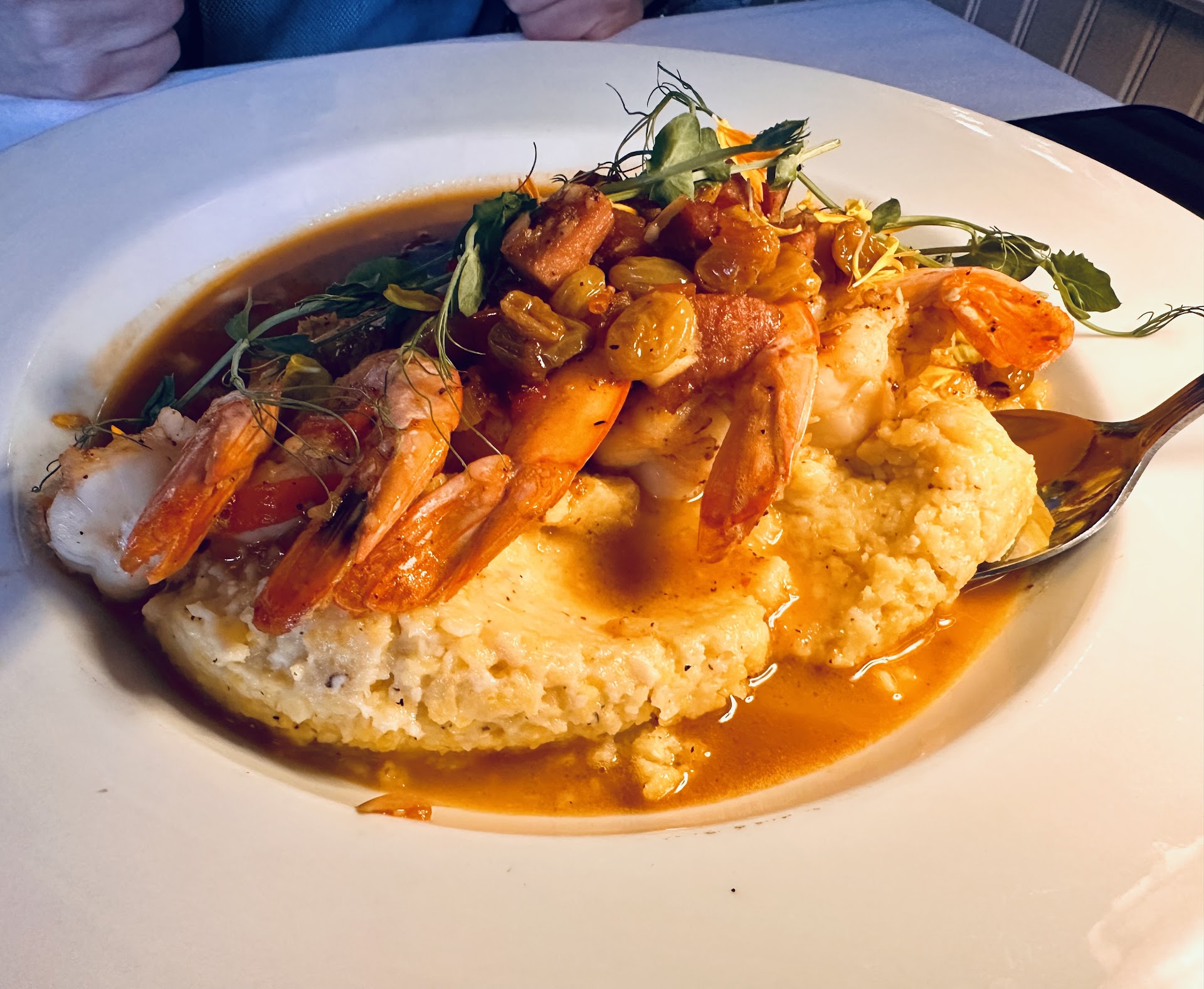 The Caesar salad with eggplant croutons was a unique and delicious twist on the classic. Shrimp and grits came with a bold tomato-based sauce and creamy grits that melted in your mouth. The steak and whipped ricotta potatoes were packed with flavor, especially with the savory compound butter on top.