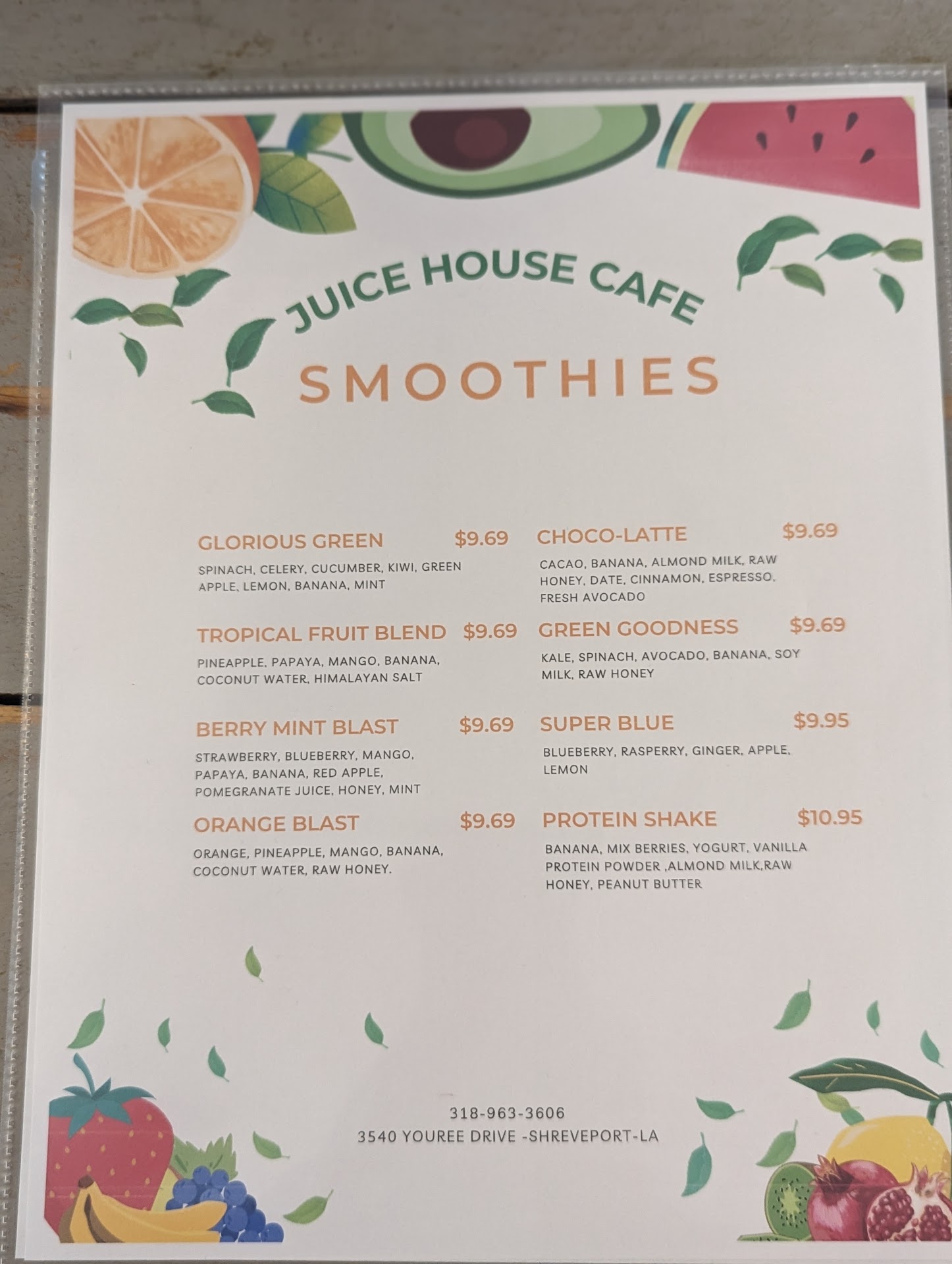 Located in Shreveport, this juice house is a hidden gem that promises a refreshing change from the usual coffee or soda. Every visit is a reminder of why this spot is a must-stop when in the area. From the warm smiles and excellent vibes at the register to the clean, calm, and inviting atmosphere, it's clear that the team behind this establishment prioritizes customer satisfaction. The selection of freshly squeezed juices and blended smoothies is the standout feature, each drink promising not just refreshment but exceptional taste. The emphasis on natural ingredients and varied flavors sets this spot apart from other juice bars in the area, making it a top recommendation for anyone seeking a natural boost of energy and a cleansing experience.