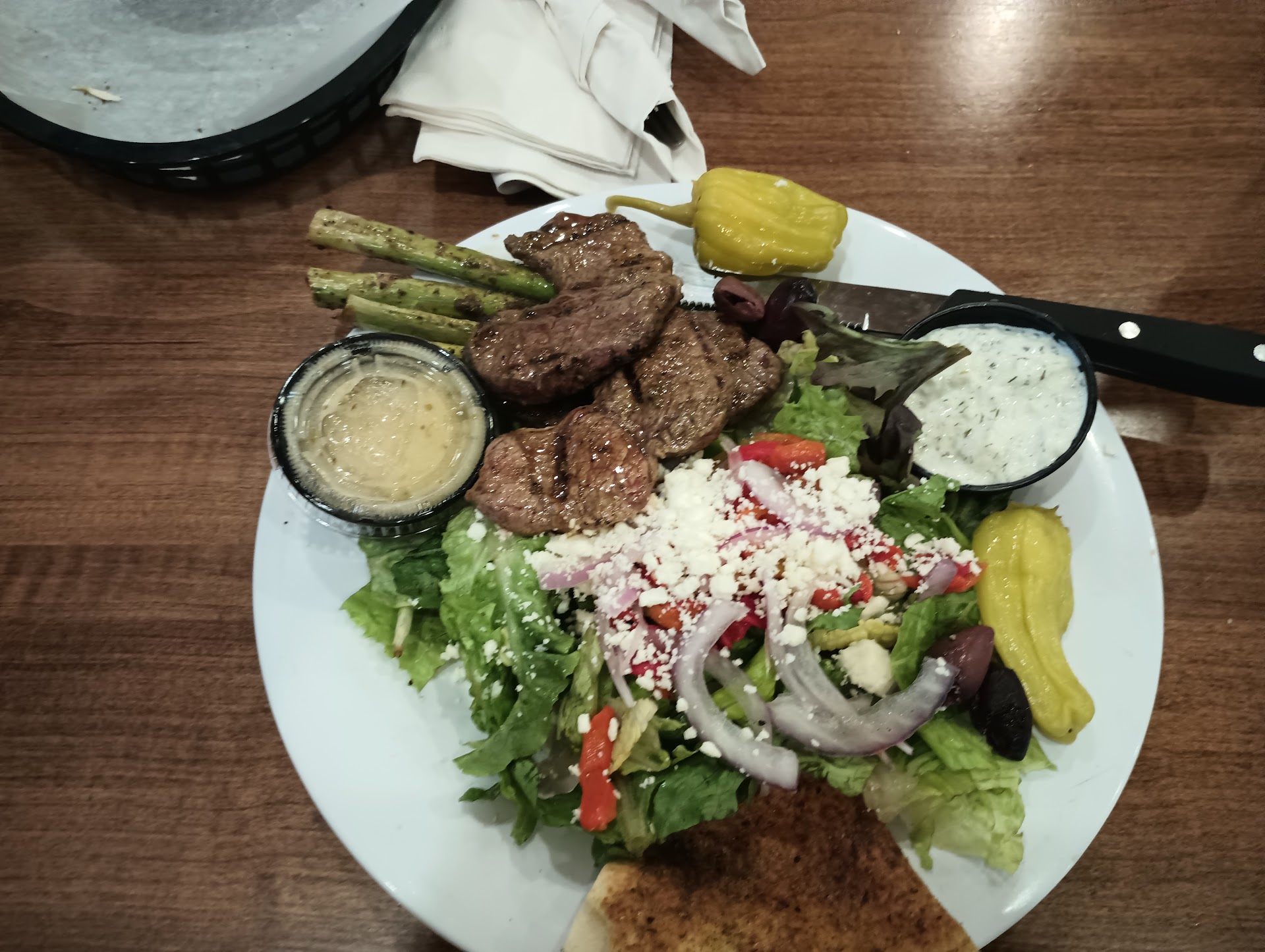 Not traditional greek food at all it isn't cooked on a vertical spit like it is everywhere else either. The restaraunt itself is clean but the food is very bland. I ordered a greek salad with gyro meat while pointing at the display they had on the counter not sure the cashier noticed because she was very disinterested in us. We sat and a few moments later what they brought out was a pita wrap with a greek salad stuffing (no meat). They offered to fix it i said no that's okay ill just take one greek salad with gyro meat to go and paid for it. When they brought it out it had beef in it. I could smell the beef, see that it was beef and my trained medical/allergy alert dog they watched me walk in with told me...HEY THAT'S BEEF, YOU CAN'T EAT THAT. I asked them if they maybe made a mistake and they said no thats lamb. I said okay i guess i will just give it to my sister then. I was going to leave it at that but then they decided to come back to my table after a couple minutes and argue that it was lamb and was just cut like beef. I no longer left it alone and asked for a refund on it since they decided to argue more. They did issue The refund and said they would make it again. (which is why i am giving 2 stars for at least trying) Had my dog check it despite knowing exactly what it was by looking at it. Still beef. I left it alone but will not be returning. Either they are not cleaning properly between cooking meats or they don't know...