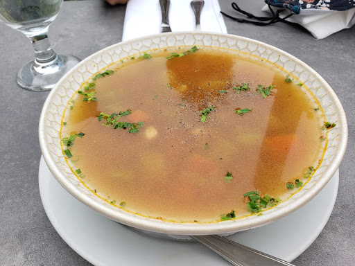 Read moreCame in for a late lunch and place was empty except for 3 other tables. We were barely greeted while a gal employee at front entrance was more interested in what she was eating than us being there. We were shown to our table by a fellow holding menus who seemed to share same lack of enthusiasm as his door partner and holding menus was an arduous tiring chore. Waitress took our order and forgot the bread she offered us to go with soup. Chicken soup was served as if it was consomme institution style; a cup worth in a bowl or a barely full laddle, rather than using the bowl size as measure, soup was acceptable. The chicken sandwich I had, the meat I found it to be on the tough side making biting through sandwhich difficult to cut with teeth and once you bit into it not much taste in the meat, if not for the balsamic vinaigrette that imparted its vinagry taste, it tasted bland, the salad paired with sandwhich was more of a touch of frisee decorative effort more a garnish than a "salad". One note that spoiled our visit was observing apparently a visitor known to staff walk in from the outside and serve themselves a drink scooping ice with their glass directly into ice with one hand without using an ice scoop and disturbing as well a young server over by the soda dispenser area where all the glassware and ice tea carafe & coffee presses are kept & drinks prepared, the gal picked up a black industrial type Cintas floor runner and began hitting the floor with bottom edge length wise open to dislodge dirt particles and dust from runner, then she rolled it and proceeded to continue hitting floor with rolled mat as if attempting to shake off all debris to clean mat in place, then removed it and swept with a broom what had come off the entire runner. This is a very unusual and unclean practice within the confines of a restaurant and more so in an area where drinks are prepared/dispensed as when disturbed in the forceful fashion as she was apparently taught to do, as any shaking or dropping forcefully disperses a cloud of unacceptable floor dust left by shoe soles on runner which should be left undisturbed on runner rather than forcing it off of runner and allowing it to be dispersed and float about in an area where coffee, tea and drinks are prepared and dispensed. This is a practice that I am sure is not BOH acceptable as most restaurants would shake off dust off runners outside their back door rather than inside while patrons are still consuming food and grill...
