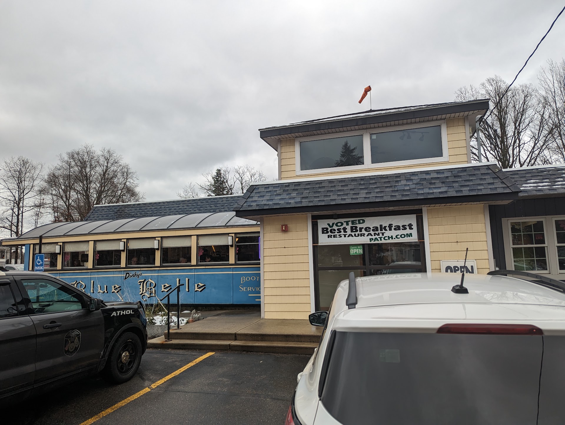 Read moreLooking for a diner for Sunday brunch and Dinky's Blue Belle popped up in my Google maps search at 93%. Since we named my wife's car Blue Belle I just had to go. The original dining car is still there but the place has been expanded. Sign up front says seat yourself and cash only (neither unusual in a real diner). I picked one of the two tables not already occupied. Menus on the table and a special board visible from all over told me I was in for a good meal. My waitress had a table of 10 but still was friendly and prompt. After reviewing the whole menu I decided on the Not-So-Dinky breakfast, slightly modified. With that big table ordering first I settled in for a wait, but the kitchen staff was great. Mine came out first. One modification was banana walnut pancakes instead of plain. Plenty of banana slices and lots of walnut pieces, covered in butter and powdered sugar. Fabulous. Hope I can make...