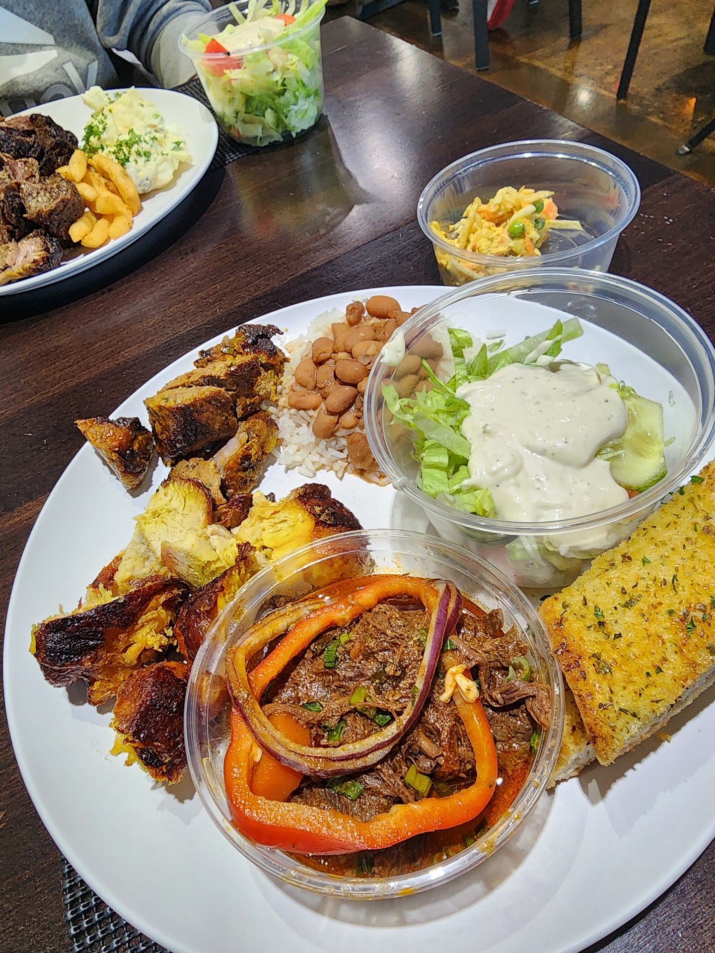 The food I ended up getting: white rice, pinto beans, garlic top sirloin, bacon-wrapped chicken, garlic bread, chicken salad, beef stew, and caesar salad. (The one picture with the focus of meat is the garlic top steak just to show the garlic-y goodness! 🤤)
