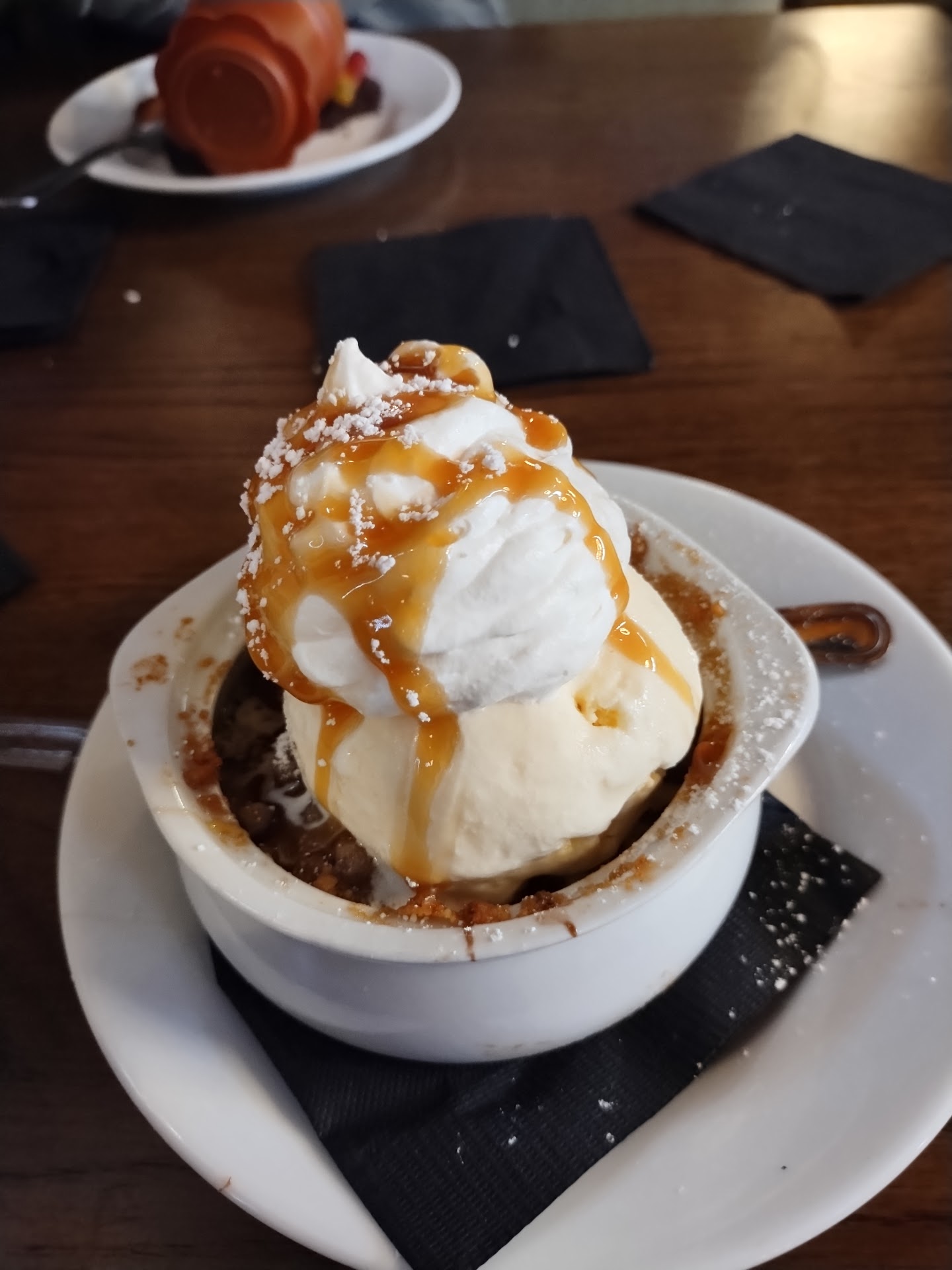 We also tried multiple desserts. The first time we ordered the apple crisp, sundae, and flower pot. The table crisp was good, though they use tart apples so it wasn't as sweet as I would like. The sundae comes in a Woo Sox baseball cap which you get to keep and while light on the fudge was what you would expect. The flower pot, which you also get to keep, was creative but nothing we felt the need to order a second time. Though they say they have homemade whip cream, and I personally found it tasty, it tastes like it is a modified or thickened cool whip.