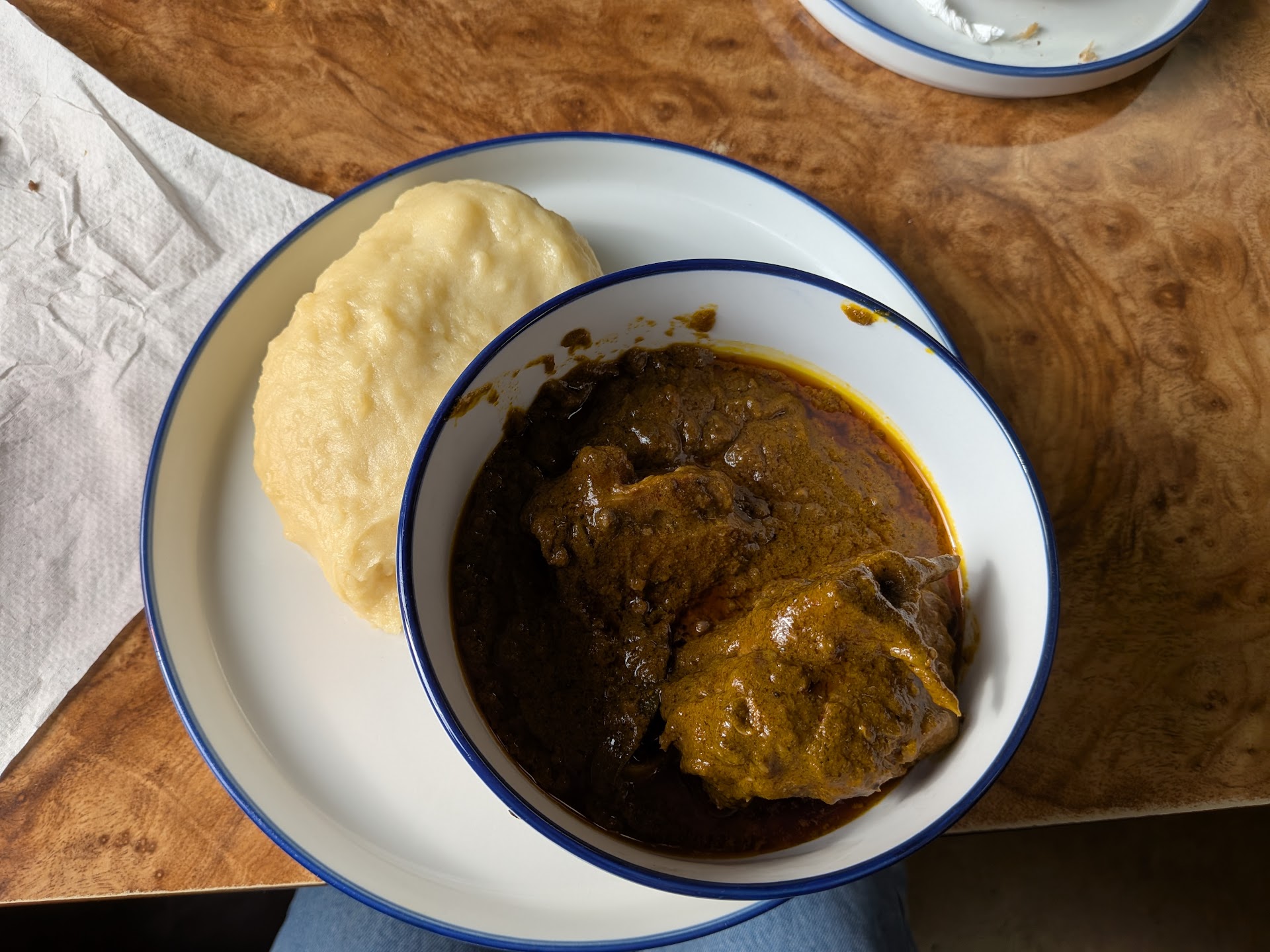 I had the palm nut soup. I wasn't sure what to expect. There was a couple chunks of lamb with bones. It's reminiscent to a curry to me. It wasn't creamy. It was spiced heavily enough that it was not super lamb-y. Normally I'm not a fan of lamb. I had the side of fufu. It's pounded cassava powder and has a texture reminiscent of mochi with a different corn-y after taste.