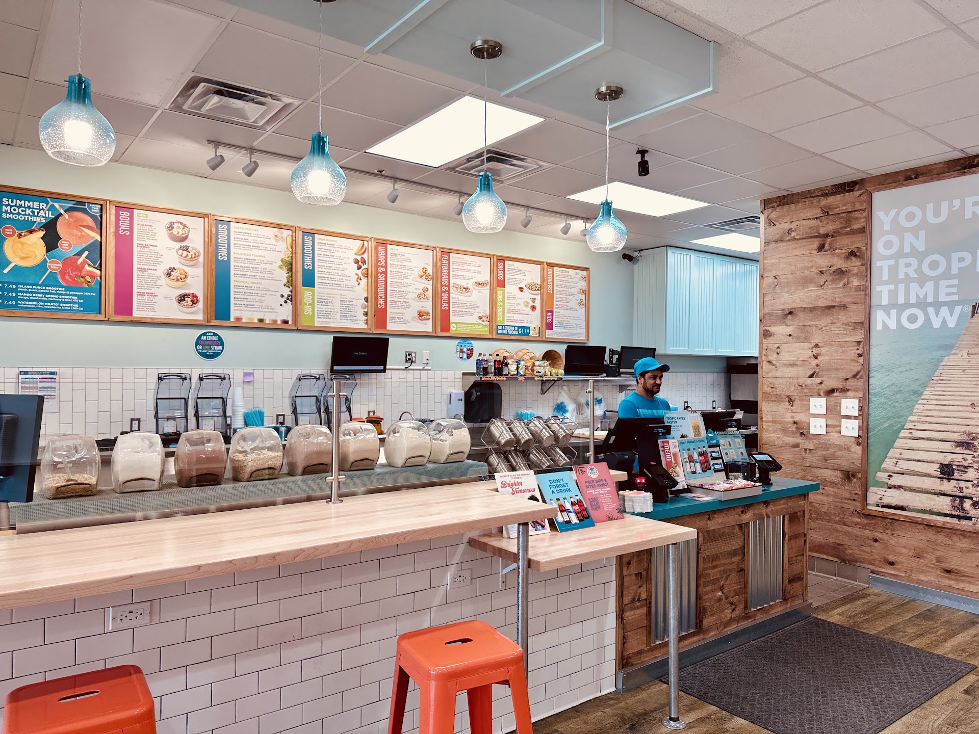 I used to live in Springfield and enjoyed Tropical Smoothie. The guy behind the counter, no offense to him, but could not speak English at all and was very difficult to work with. he was nice but just didn’t speak English. Secondly, I got the Thai salad and got like three pieces of chicken and a child size salad for $8.50. The smoothie is always good but nothing to brag about. The five teenagers that I was with spent over $20 a meal and they all left hungry very very disappointing. The atmosphere is good, but they have very little seating. Just not interested...
