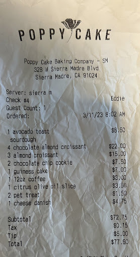 Seriously. This is the best bakery anywhere in the San Gabriel valley. It surely must rank in the best bakeries in all of LA County. Their croissants alone qualify them for that status. After having lived in France for almost two years, I could never find a decent croissant anywhere in the States that came close to what I could get in Europe. Until I bit into one of Poppy Cake's croissants. Good grief. They are really that good. Perfectly crisp and crunchy on the outside, and decadently chewy and buttery on the inside. And truly, pretty much all of their other baked goods are at that level of excellence and perfection. Their freshly baked breads are some of the best around, especially the Country White and the Multi-Grain. Their many other baked goods are exquisite - the almond croissants, the apple bear claw, and their morning buns are all baked to perfection and have just the right level of sweetness so they can satisfy a craving but don't make you regret eating too much sugar. Their sandwiches are consistently good, their Fried Chicken is fantastic. And their chocolate cakes are heaven. We go there several times a week. Their chocolate chip cookies are so incredible, it's hard to share them with the kids. How on earth is a bakery...
