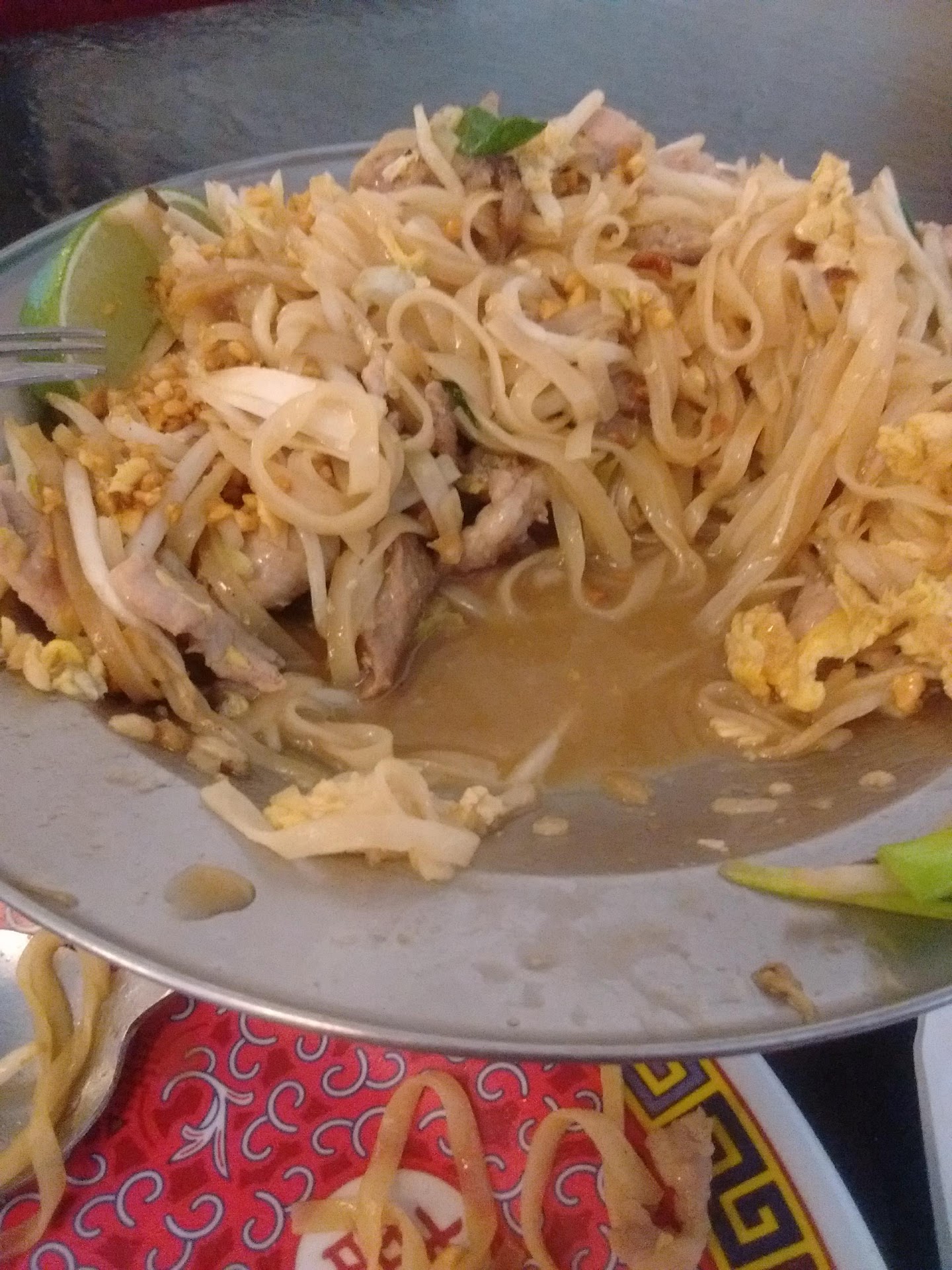 Pad thai-no basil or cilantro? Not recognizable as pad Thai, just a soy drenched brown sauce. Also had broccoli, cabbage and zucchini which I have never seen in pad Thai before and not on the menu. Onion was on the menu, but also not a common thing in pad Thai.