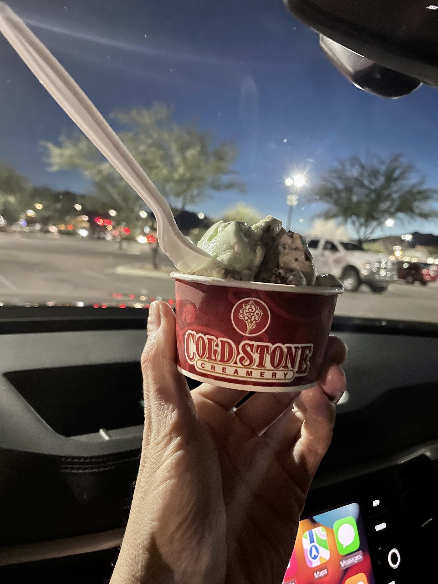 However, I give 5 stars to the worker named Jazmyn, that's what was on her name tag, who was doing her job and trying to help customers nicely. She was working quickly, efficiently, and doing everything from taking orders, fixing the orders, and then charging for the orders. She was kind and did a good job of fixing my order to go. She put the ice cream in cups w lids so it wouldn't spill in the car and did the waffle cones separately so they wouldn't get soggy on the way home, see picture. Also, she made sure customers didn't wait too long.
