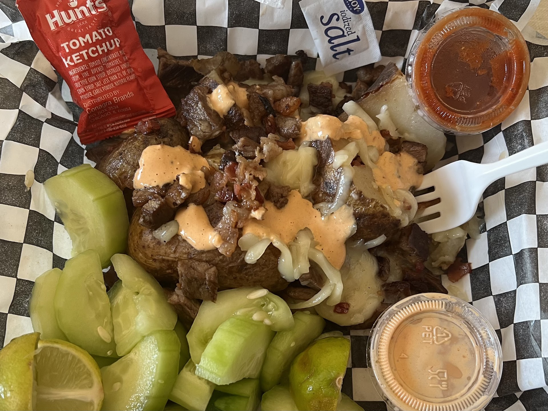 Delicious! First time here and Iāll be back. The wife and I both had a Full Baked Potato. Potato was done perfect. Meat was spot on, zero fat or gristle. Fresh cheese and the included condiments were a perfect touch. Presentation was nice! I got it to go but both the work and seating areas were clean and squared away. Customer service was excellent. The guy who took my order was pleasant and the food came out in a more than timely manner. Well priced with good portions too! Lastly, a huge shout out to the chef for a perfect meal. Well...