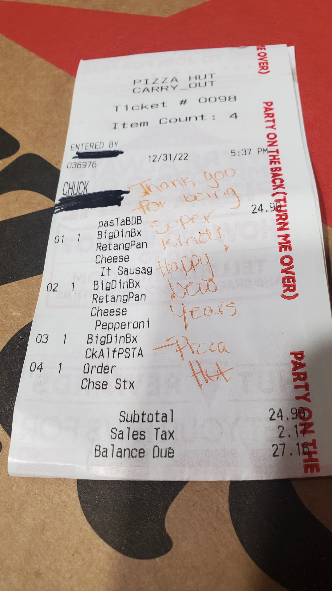 Read moreOur friends brought over 4 pizza's today for out Easter Eve late morning get-together and they were terrible! First they got the order wrong, but then, the crusts were dry and it was like eating cardboard! My father worked for Pizza Hut for almost 22 years. When I say I know good pizza, I know what I'm talking about! I used to do secret inspections for him and I really do know what Pizza Huts products should taste like and by far this wasn't even close! The Pizza Hut Bistro makes a much better product! With that said, we have given this location several tries. But since the remodel, a few years ago, the product has never been the same! We will never be back! Please fix your issues Pizza Hut! I know you are taking short cuts and not taking the time to make a good pizza! I hope corporate See's this review and comes in and shakes things up! This is not Pizza Hut quality and it starts with management! Thank you...