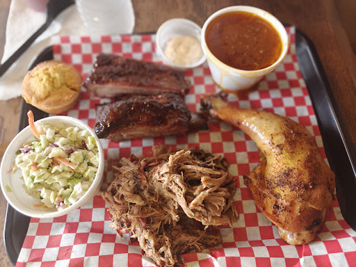 Chicken,ribs and pulled pork with their 14 hour bourbon baked beans and coleslaw