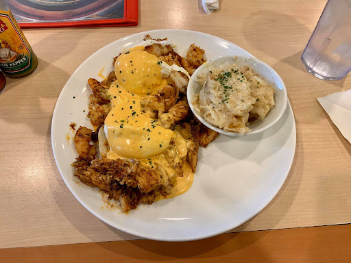 I had ordered the Cajun Benedict, as this is what the place is known for, and I got the potatoes as a side due to the waitress’ recommendation. The sauce was savory and extremely flavorful. The shrimp was crunchy in some parts but soft in some others - I could tell that it was freshly seared. The mahi-mahi was chopped in chunks and similarly seared. There was an ample pile of seafood in between the egg and the muffin. The seafood appeared to be seasoned as well, and at times, it seemed a bit overwhelmingly salty, but the relative blandness of the egg and the sweetness of the muffin assisted with that. The egg was soft and plump with a still runny yolk. The muffin was soggy with all of the right juices and I enjoyed every bit of it. The potatoes were in the form of a casserole, were thick and creamy, and were everything I had hoped they would be.