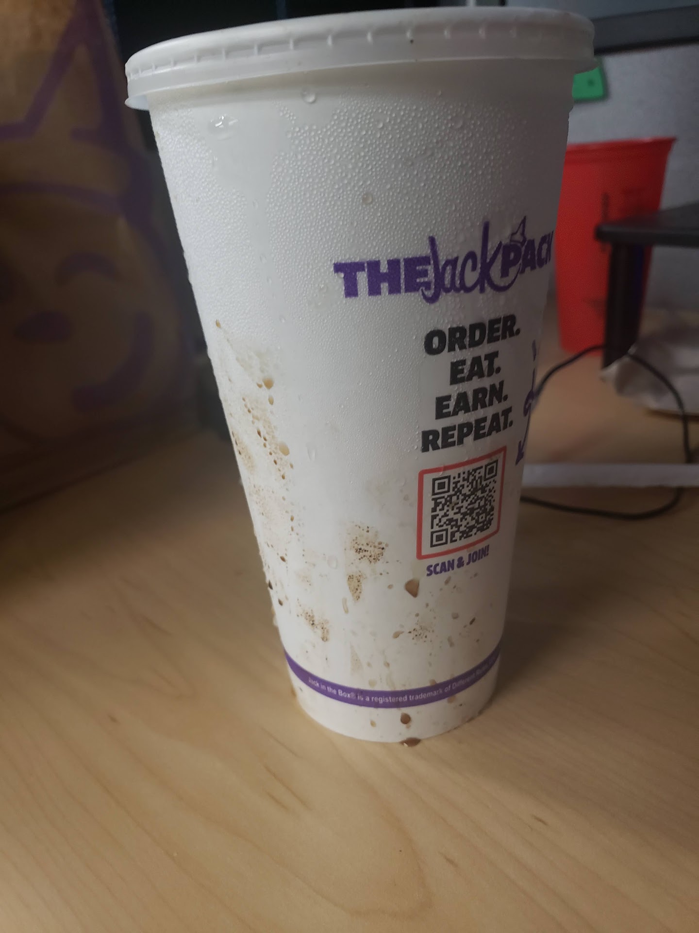 Read moreThere was 1 customer inside and I was the only one in the drive-thru. I ordered breakfast and lunch for myself and a friend at work which is where I am now. When I pulled in, my GPS said I should get to work by 647am. I figured even if they took 10 minutes to make my food I would be ok. But it took 20 minutes for them to hand me 2 breakfast sandwich combos 4 drinks, and a double sourdough jack combo. And right now after looking at my drink as I grabbed it to come inside, I was disgusted. My coke cup was filthy on the outside and has fingerprints all over it. It also looks as though the woman took a drink or was drinking out of the cup she filled because there are 2 lipstick spots under the lid where someone's mouth was on the cup. This was the second day in a row I visited this jack in the box on my way to work and today's service was horrible. I am afraid to even eat my food because what if this woman touched my food as well with those filthy hands. I spent almost $35 on 3 combos and an iced coffee and thw only thing that im gonna a touch is the iced coffee because I need some coffee this morning. I want my money back. If you don't think I am calling to give them a bad review on their survey too, you...