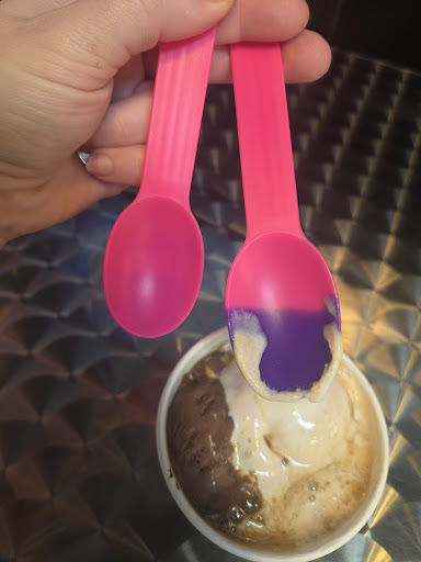 There were 3 distinct regions of counter. Far to customer left was the name brand ice cream display with their deep, round tubs. Far to customer right was the pay-station and contraptions for making coffees, frozen drinks, and the assortment of other dessert curiosities.