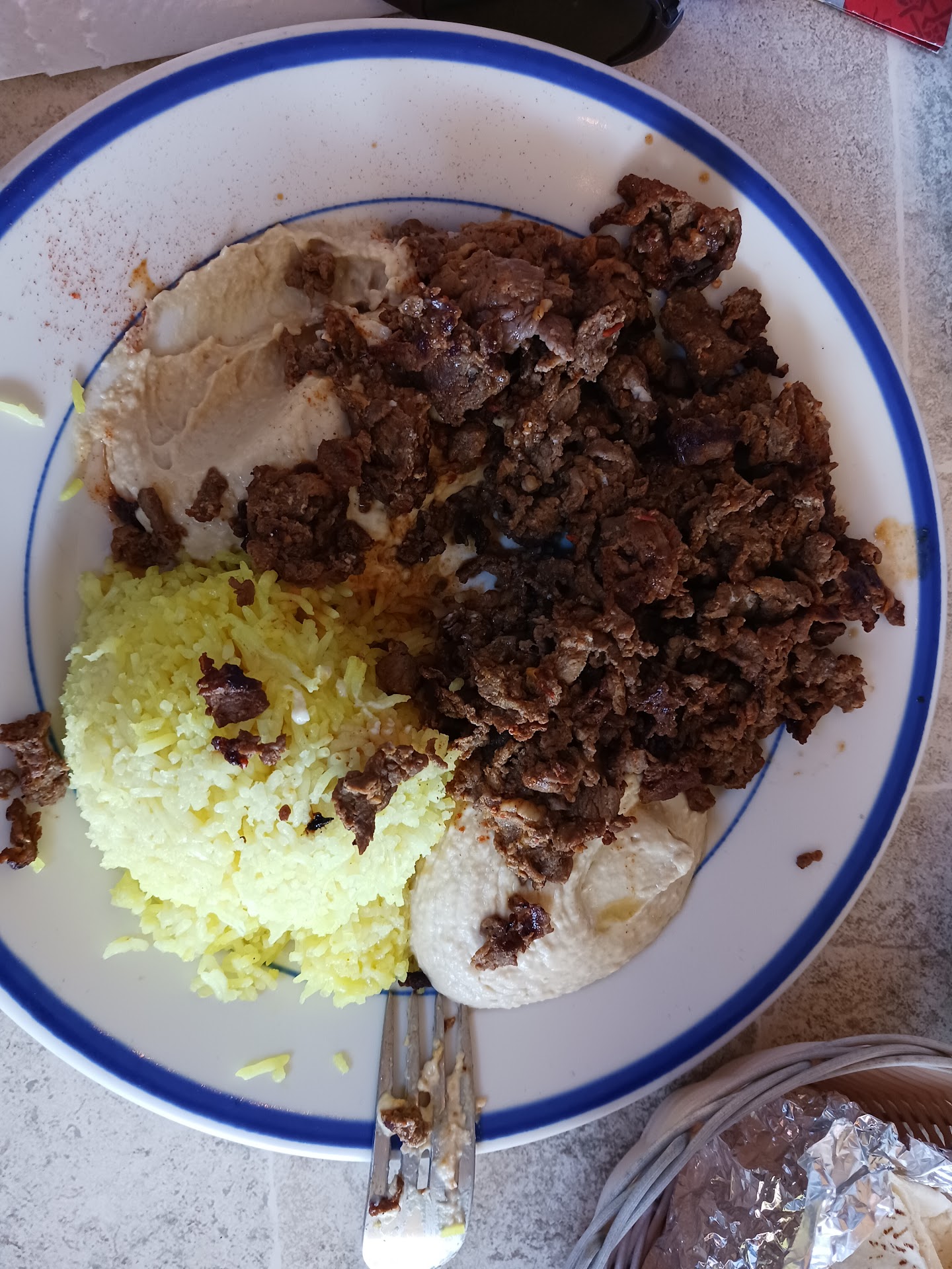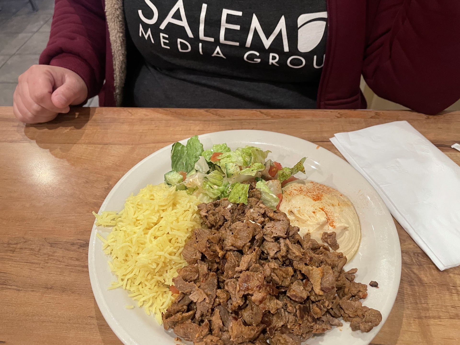 I got the sliced lamb plate, which also came with hummus and a salad. And some pita bread as well. It's like chipped beef, but lamb. Really tasty, quite flavorful. It's tangy, it's juicy, it's tender and moist. Since it comes with a few Pita breads, I made little mini Gyros, if that's what you want to call them. Spread some hummus in, put in some sliced lamb, and you're good to go.