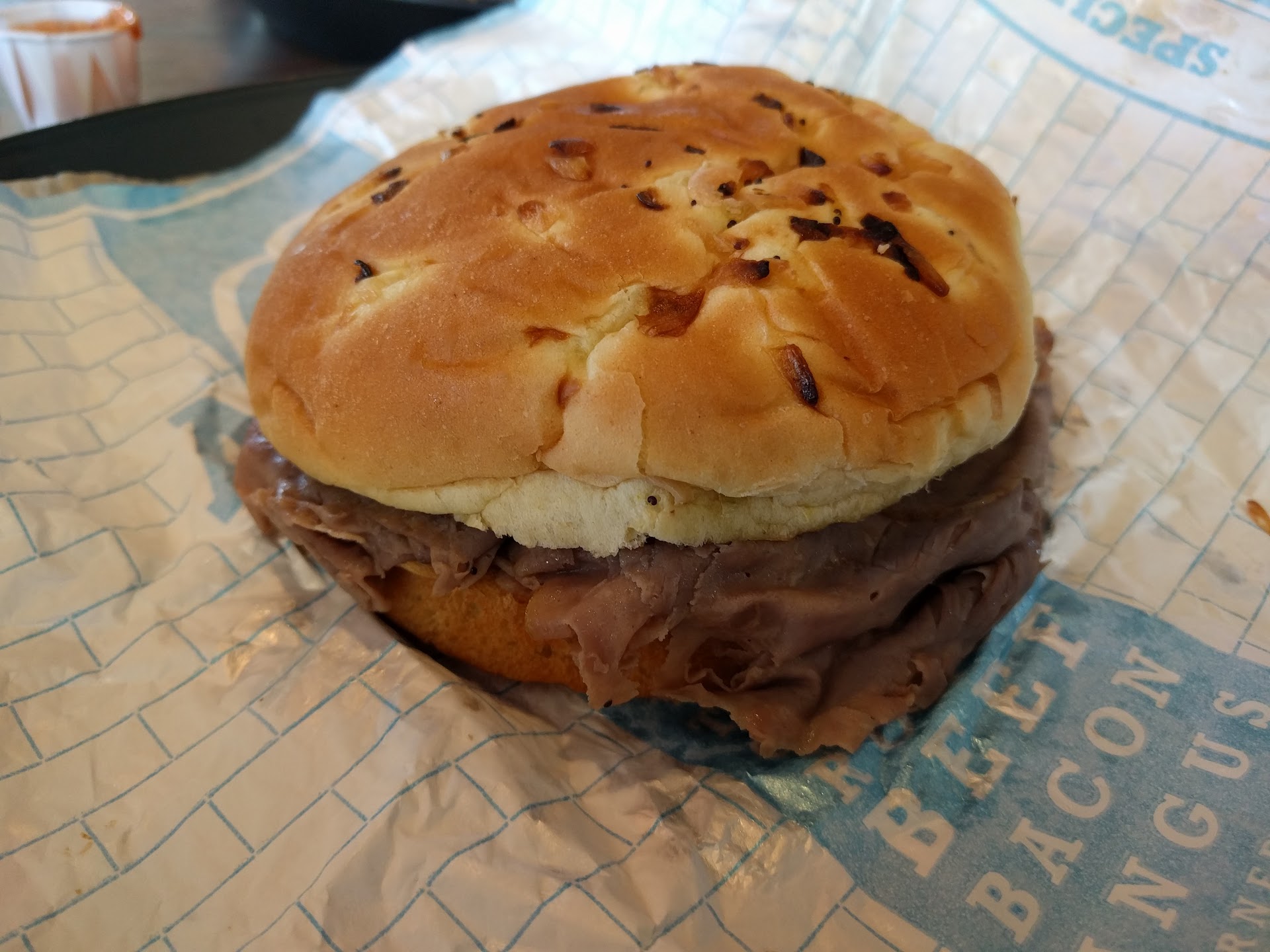 UPDATE I've decided to change my review based on the response from management that I received shortly after posting. The manager quickly determined that I'd been served the wrong type of meat: brisket meat instead of the thinly-sliced and tender roast beef.