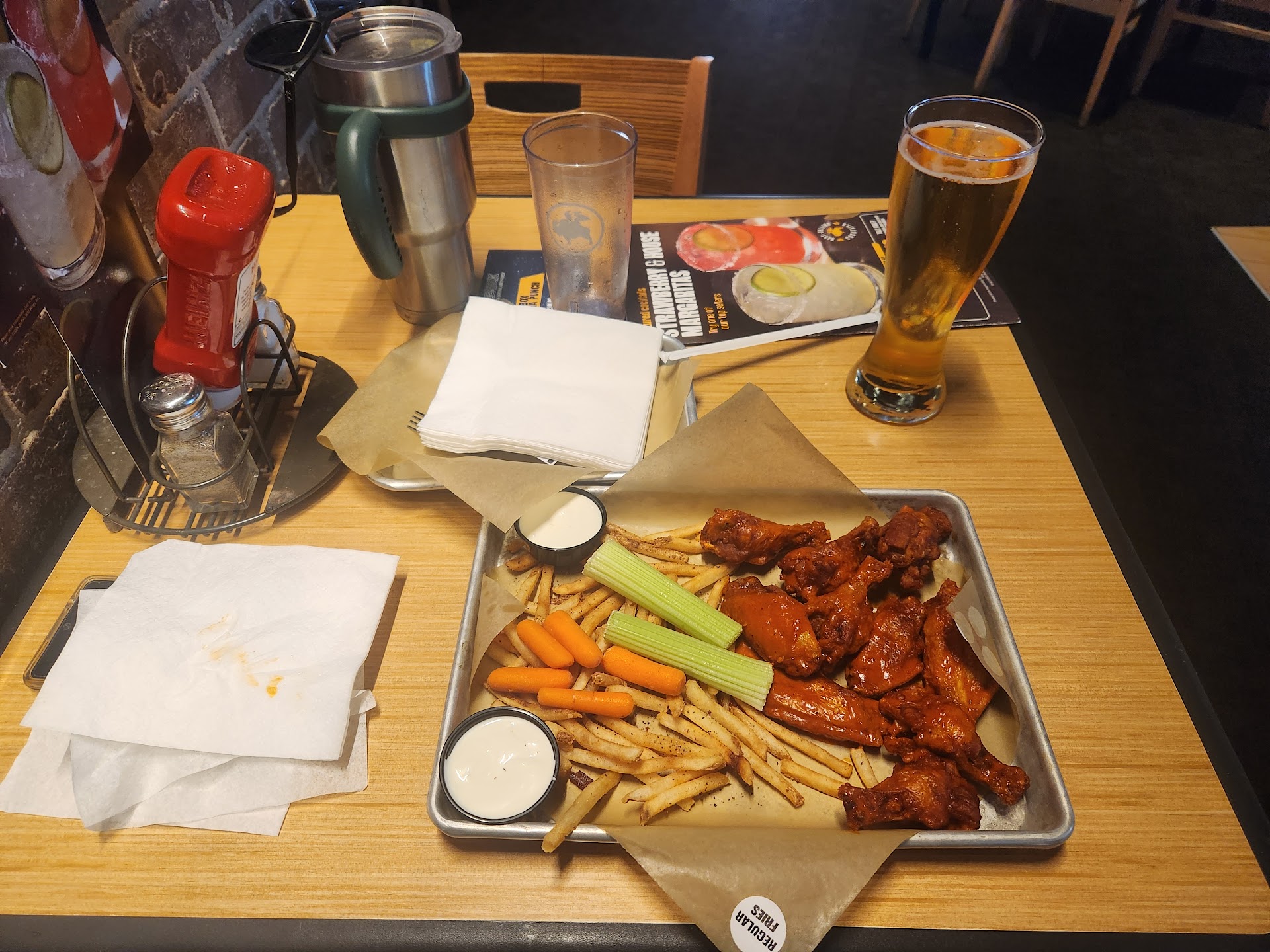 After a bit of a wait, we placed our orders. I opted for the âall you can eat wingsâ deal. According to the card, it includes a choice of ten wings, fries, carrots & celeryâ.
