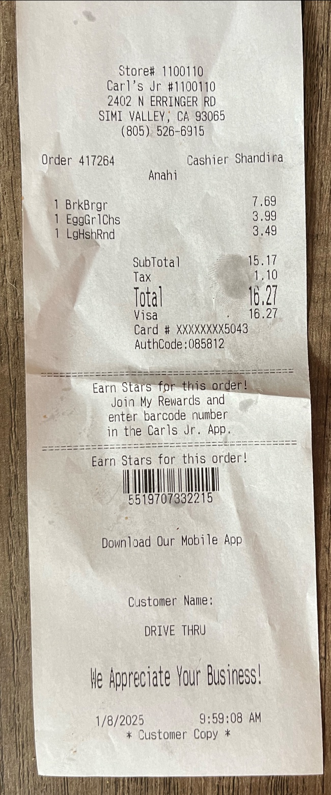 I pulled up to the driveway for a drive-through order and the girls said one second. I said sure 10 minutes later she says have you been helped I ordered two breakfast sandwiches and some potatoes. I am the only person in line and I have to wait another 10+minutes at the window with my car in park turned off all. And for my sandwiches to be cold!! That was the final straw! when I decided to call and make a complaint about this, looking at my receipt, they have no number to call that is active. I tried calling the number at the top, which is not in service. I do not have the app will not make any further attempts to make a complaint. shouldn’t of been a nice guy sitting there waiting patiently. honestly every time I come through this specific Carl’s Jr. they always do this either your order is gonna be wrong or you’re gonna be the only person in there and you’re gonna have to wait...