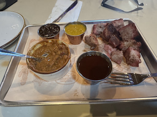 The pulled pork sandwich was lacking flavor and extremely dry (2/5). The crispy chicken was delicious and a great value for the price (massive sandwich easily 4.5/5). For the 3 meat platter the pork was the same story just dry and no flavor (2/5). The ribs even though our server recommended them, we personally just did not like the flavor and how they were cooked. They lacked the flavor the menu said they had and were just not that fall off the bone you hope for with some Texas BBQ. But was cooked to a competition style and personally they just did not hit (1/5). Lastly the brisket, was cooked to the perfect tenderness to where it melts in your mouth and has great texture. But again the the flavor was just not there in the meat beyond parts of the crust, which shows an uneven seasoning across the brisket (3.5/5).