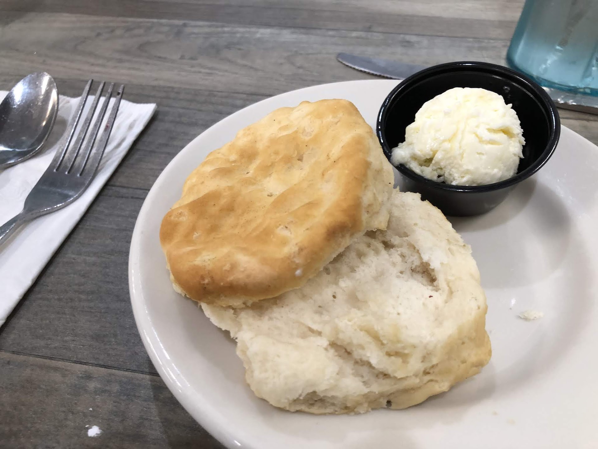 I had the 2 egg breakfast with egg whites, hash browns, and biscuits. The eggs and hash browns were good enough, but neither had a lot of flavor. The hash browns were cooked correctly all the way through (not always a given at breakfast places) and not too greasy, but they were a little dry.