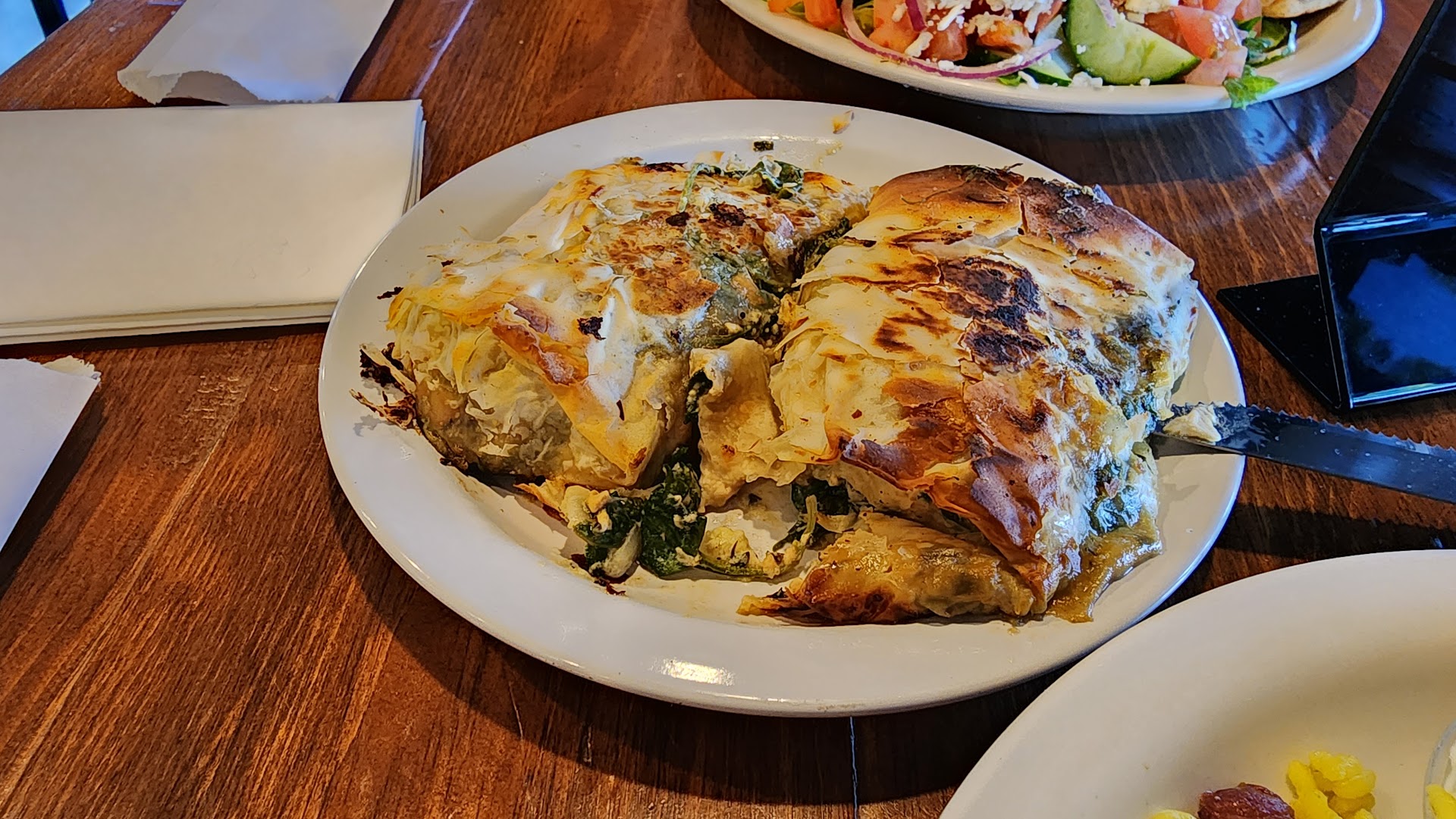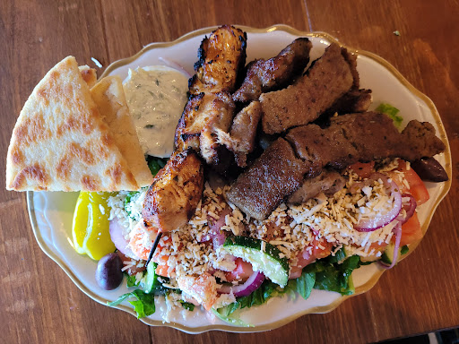 The menu is expansive. There are so many items to choose from. I chose to focus only on the lunch plates. I decided on the lamb kabob plate since I'm a big fan of lamb. With the lunch plate, you get a choice of two sides between salad, fries, and rice. I chose salad and rice. We also decided to order an appetizer of spanokopita. The spanokopita are ginormous compared to other Greek restaurants. They were delicious. We brought them home to snack on later. The lunch plate was piled high with food. The portion is large. Besides the entree and two sides, you also get some pita bread and tzatziki. The lamb was tender and seasoned perfectly. It had a lovely flavor and did not taste gamey at all, which can sometimes happen with lamb. The salad was also a good-sized portion with a nice Greek oil-vinegar dressing.