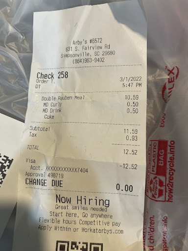 Read moreJust had a poor experience at Arby's on Fairview in Simpsonville. I had a fairly large order so I asked my grandson (14) to check and make sure we had everything. It looked good so we went home. Well, they forgot all the sauces and an order of chicken sliders. I had to go back . There was an enormous amount of traffic on Fairview. I had to go down to the light at Wells Fargo and work my way back. The young lady at the window gave me our sauces and I was told to pull forward for the sliders. While there I purchased a small lemonade. All together my order was about $40.00. The cashier apologized but didn't offer any kind of compensation. ( I wasn't looking for a freebie but at least an upgrade to a large drink??). Anyway, as I'm leaving she said "Your slider was here after all" and handed me an ice cold sandwich. This was a very unsatisfactory visit indeed! (Although, as I said the cashier was...