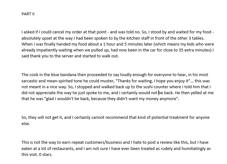 PART 1: TLDR; Rude Customer Service / Kitchen Staff
