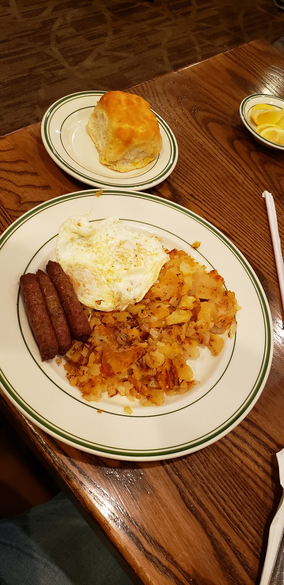 Read moreMy family came here to celebrate my sister's birthday, and we walked in at 3PM on a Thursday. The atmosphere was peaceful and clean. We were almost immediately seated, and our wonderful waitress got us started with our drink order. The waitress was extremely kind, and she even helped my mom decide what to order off the huge menu! A few minutes later, our cornbread arrived, and it was absolutely amazing! The inside was warm and somewhat doughey, while the top was perfectly crisp. I ordered the Big Texan burger with bacon and sweet potato fries, my mom got a gyro with normal fries, and my dad got broiled pork (idk what my sister got đ); Our food came out, less than 10 minutes later! The burger was juicy, flavorful, and fresh. My mom loved her gyro, but my dad's pork came out fried. However, the waitress kindly took the pork back and had the chefs make broiled porkchops, which my dad really enjoyed! Sadly, the sweet potato fries weren't very flavorful, and they were quite firm, with only a little crispness on the edges. My mom's regular fries were fantastic, though, so I'd just get those instead of the sweet potato ones (my mom liked the sweet potato fries alright, so maybe they just didn't fit my personal taste). Also, on a side note: the bathrooms, although pretty small, we're really nice! We ordered dessert to go, and I'll update this review once I try my chocolate cheesecake. Overall, I highly recommend eating here, and I'll be back for future meals! Edit: The chocolate...