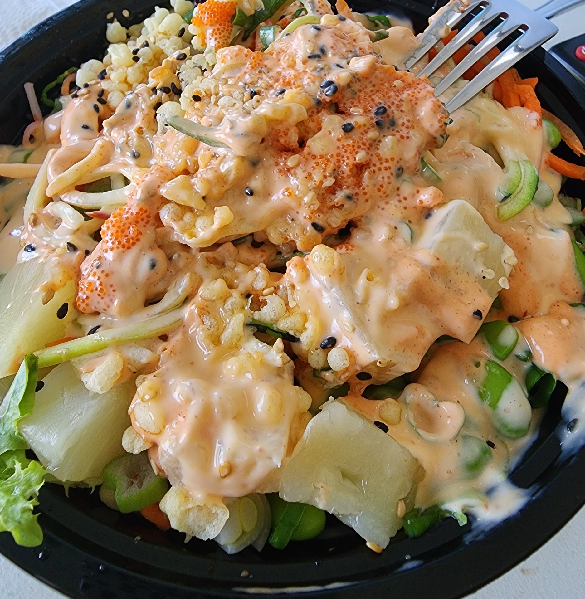 $30 for a custom bowl and drink and a kids bowl. Did upgrade the $1 Krab on both bowls… but! Got about 1/3 of a stick on each which across the street at food lion you can buy the same Krab with 6 sticks for $0.99 making that upgrade based on food lion price a 1000% mark up. Veggies are decent quality but the corn and fruits clearly come from the can and you can really taste that in the mango which is unfortunate because I really like fresh mango in my poke. Meats are sub par to start and then handled at poor temperature making it just enough to be edible.