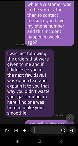 I went to this business on 2/12/2025 for smoothie. The smoothie did not taste right. I was not satisfied with the smoothie. The company offers customer satisfaction guaranteed if you are not stratified with your smoothie, they will remake it. The employee remade the smoothie. The remake of the smoothie still did not taste right. After the 2nd remake I discovered on the receipt the employee did not ring up the smoothie correctly and I had been overcharged. I contacted the store manager while in the store. She requested that I come while she was there to get the refund and to get a remake. I returned to the store on 2/24/2025 to get the remake and the refund. After the remake of the smoothie the store manager Faith told me she was informed that I would not be able to be serviced unless she was the store. I asked her who informed her of this and she said Brian the owner. When I first entered the store, nobody was in the store. The manager did not inform me of this information until after a customer entered the store and she was not discreet when informing me of this information. The manager has my personal contact information as I communicate with her on 2/12/2025. After I left the store, I advised her by phone and text message to let her know that she could have informed me of this by phone as it had been three weeks since the incident. I advised her that not only was it unprofessional, but I was humiliated and embarrassed. She informed me during the phone conversation that the owner said that I could not be serviced at all at this location and that she wanted to stay out of it, but the owner instructed her to deliver the information. I feel as though the act and manner this information was delivered to me was intentional. It was to humiliate and hurt me. I am being discriminated against by the company.