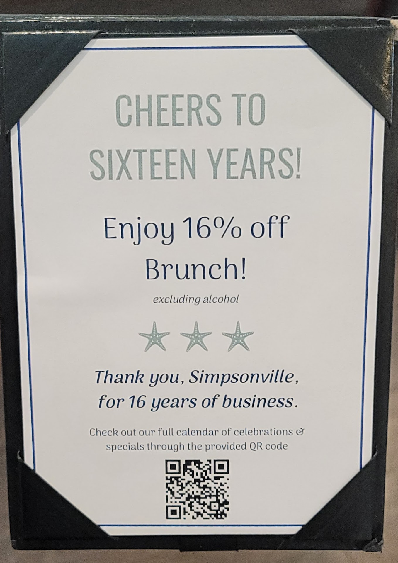 Lastly, they're offering a 16% discount on their brunch menu to celebrate 16 years of success in Simpsonville. How can you beat that?