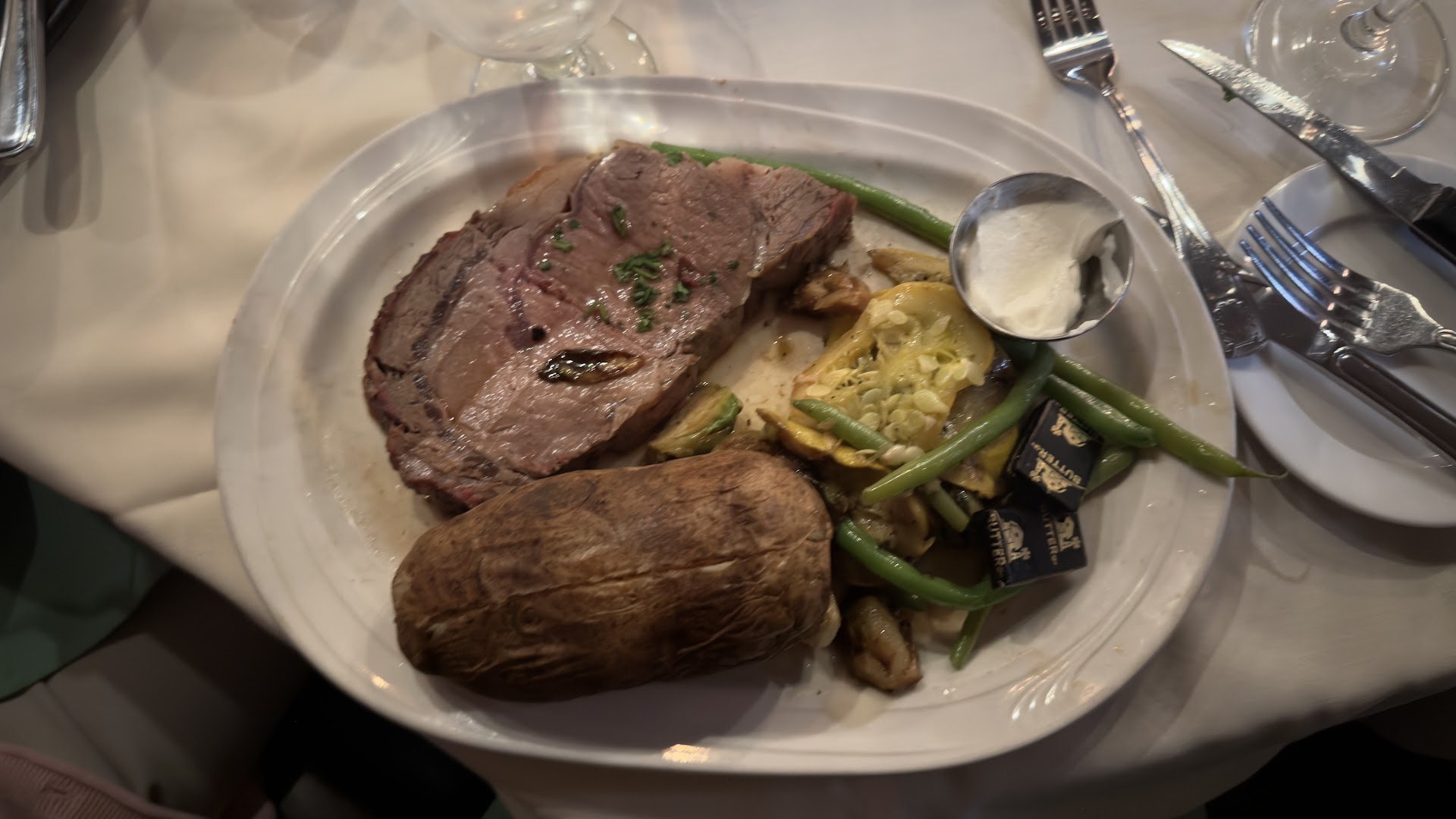 Deciding we all wanted beef, we ordered a bottle of French Burgundy to pair with our meals after some discussion. Full bodied, smoky and distinct it was the right choice. Our friend chose the 14 oz. Prime NY Strip with chilled garlic herb butter, and a baked potato and spinach. I chose the center-cut filet mignon at 8 oz. with the classic veal demi-glace, parmesan fries and spinach, and my partner chose a surf and turf special which consisted of three stuffed shrimp and 4 oz. of steak with a baked potato and Brussel sprouts. For the price, I can't say the beef was memorable. No complaints, it's just that I remember a really good steak when I eat one. My two dining companions thought the same.