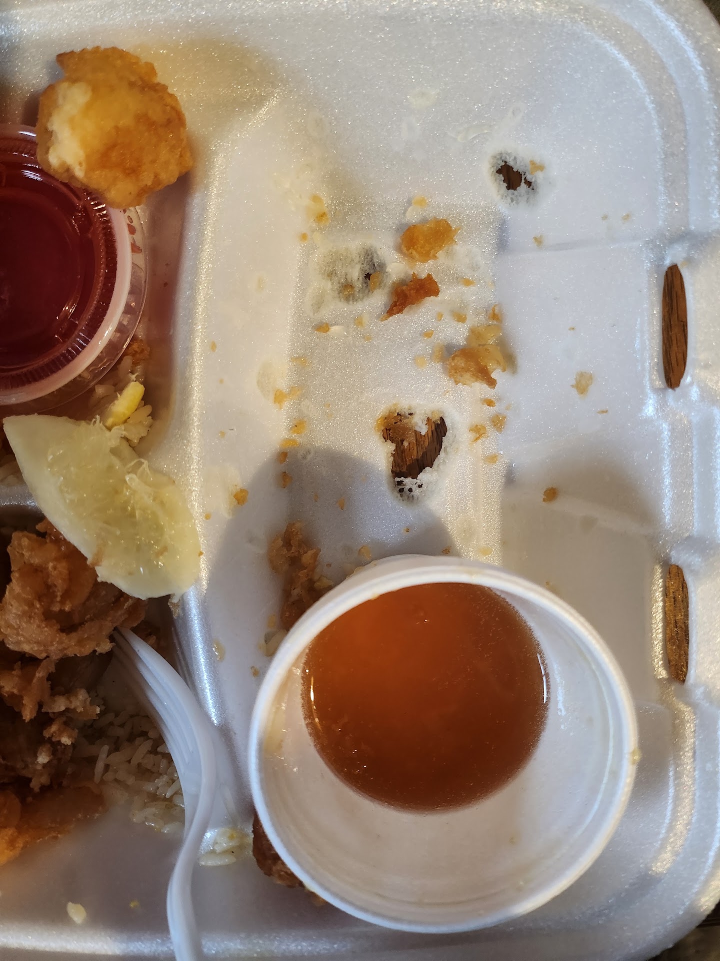 Read moreI was brought this for lunch and was told it was pretty good. Well, the wonton soup was so salty I couldn't eat it at all and the wontons were simply wanton wrappers with nothing in them... just big noodles basically.... typically wonton have something inside them. I'm not sure whose idea this was... The chicken was hard as a rock and my lemon was mutilated... the egg roll looked like it was fried 3 times and the chicken was so hot that it burned holes in my Styrofoam which can't be good for anybody's body to ingest.
