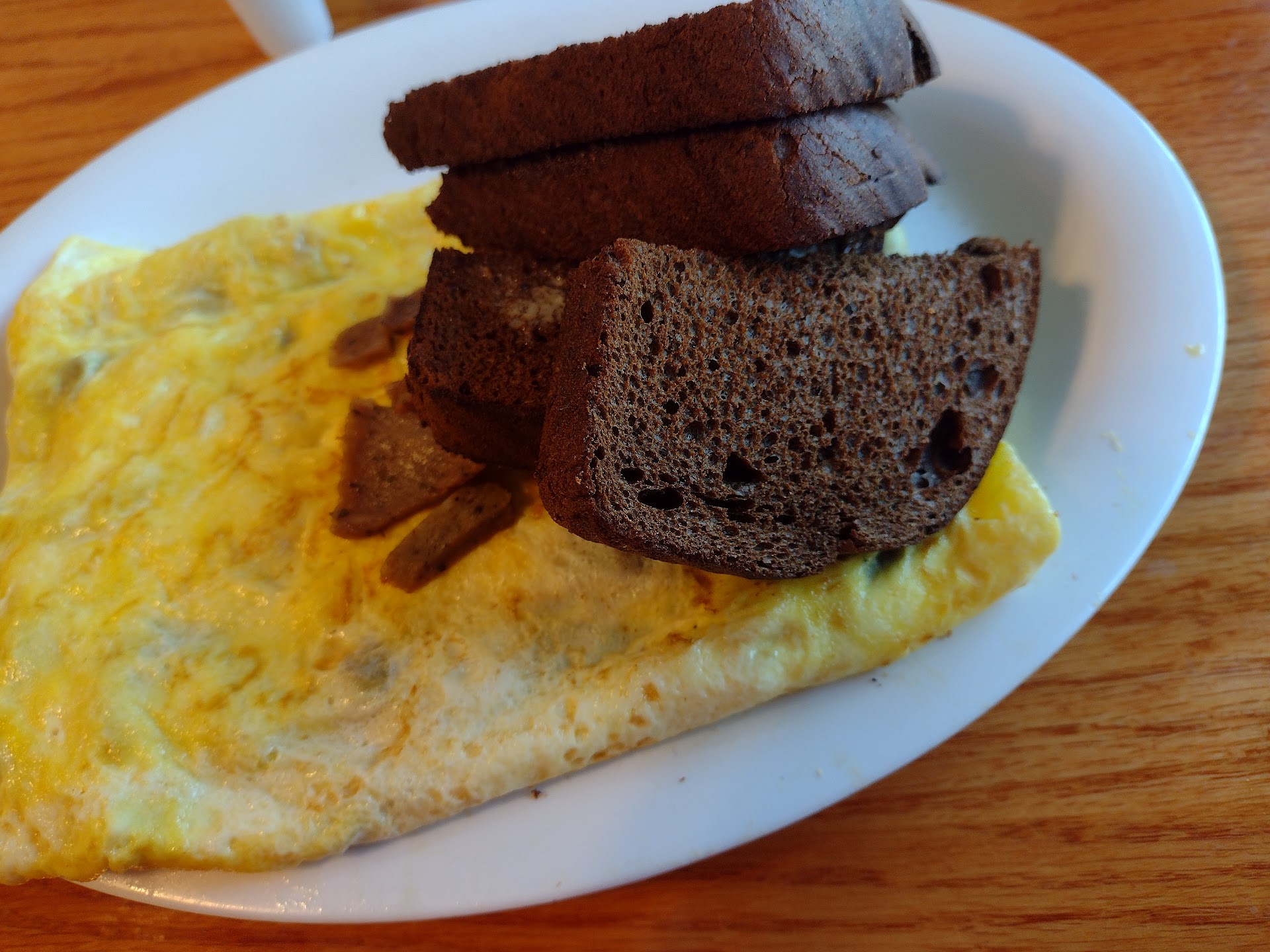 Read moreThe Kraft single on top made this omelette look really unappealing. Cut it open bacon was super dry and salty. Sausage had a strange flavor can’t really describe it and the ham was ham no complains there. For $13 could’ve been way better. But I will still give a Doug score .