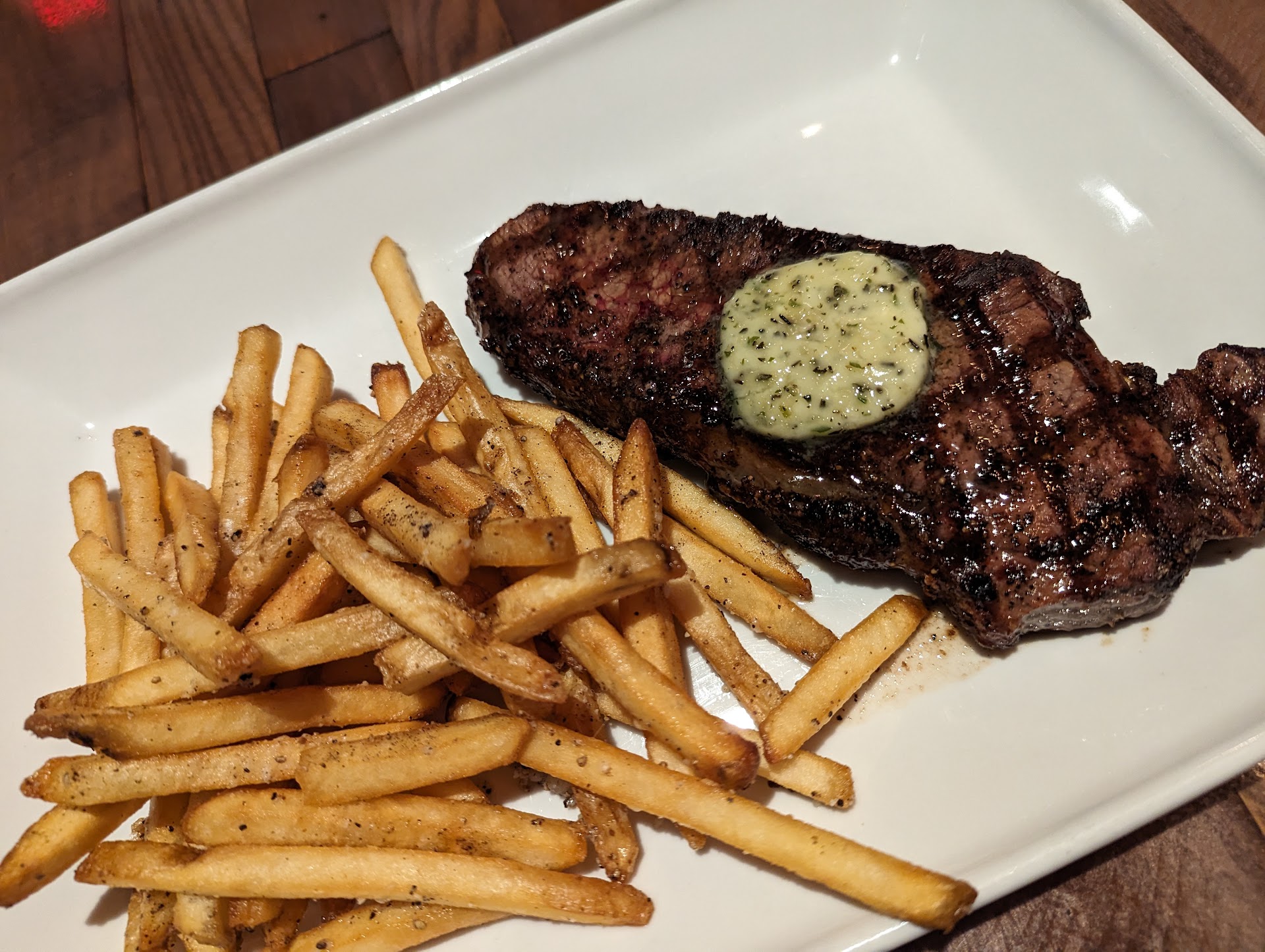 Husband loved the fries and thought burger was just ok. The main problem was with my steak and potato. Potato was completely undercooked but that was all I could stand to eat if that gives you an idea of how much I liked the steak. I have a difficult time describing the steak other than the taste was bad enough I questioned whether it was even beef. I get ribeye at almost every restaurant I go to and have never tasted one like this. I thought it was possibly the seasoning but it was most definitely the flavor of the meat. It had almost a "gamey" flavor. It was cooked to perfection but unfortunately I couldn't eat more than a few bites. I'm not one to send food back unless its prepared poorly so my husband ate it to avoid wasting $41. He agreed the taste made it very difficult to eat.