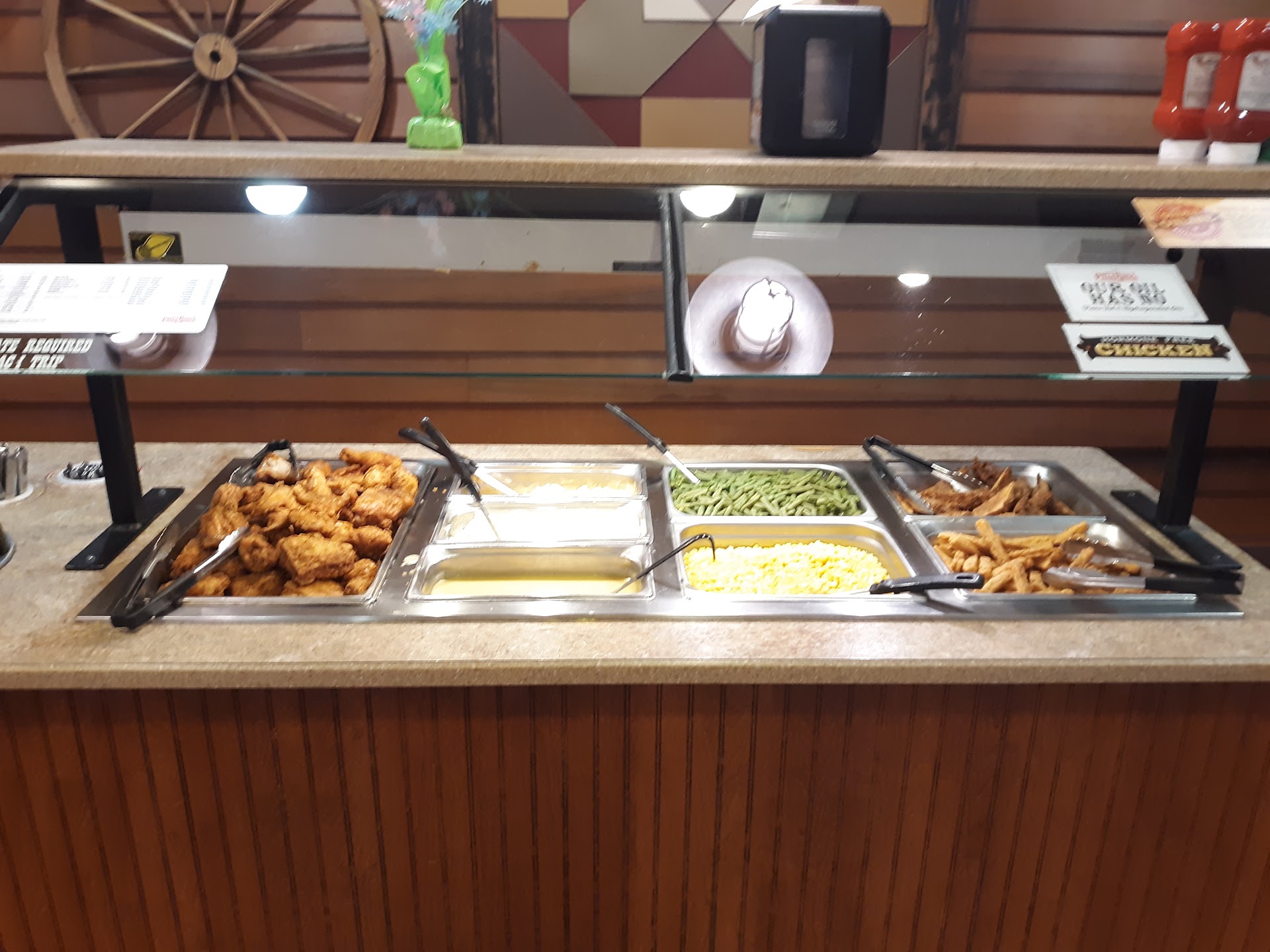 To describe the atmoshere, as Google requests, there was a table of high school boys in the middle of the seating area, and on the other side of the middle wall (me and the girlfriend decided to sit more or less in the corner, as far from the other patrons as we could) was a child watching or playing something out loud on a tablet. A child ran in front of me several times while I was getting my food, almost making me drop my plate. One of the first things I noticed once inside the restaurant was that the whole seating area smelled like a McDonald's PlayPlace. Someone nearly hit me with their pickup truck while parking.