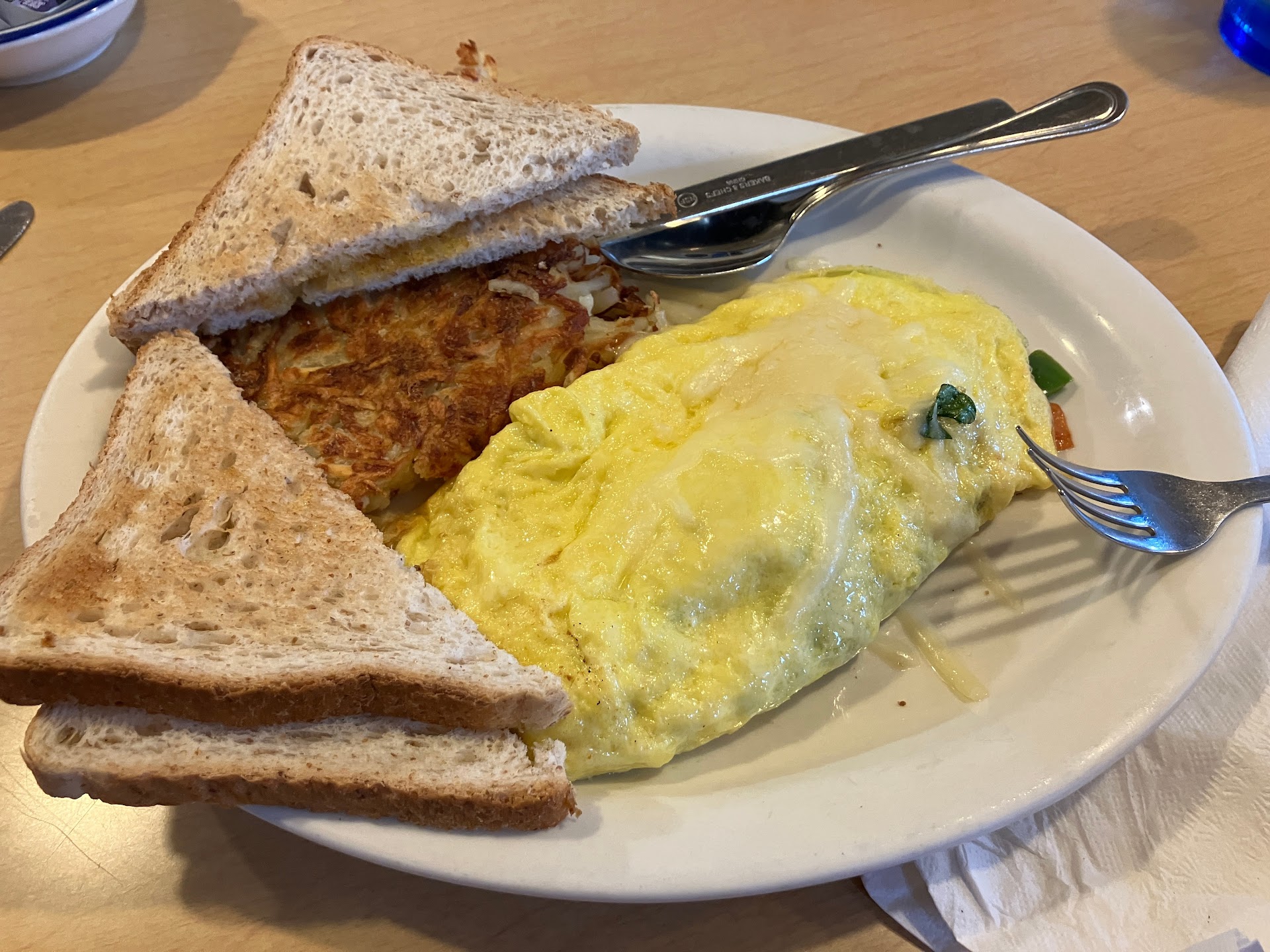 Unfortunately, the food isn’t that great. I was stunned that an vegetable omelette could be almost completely devoid of flavor. The same was true for the Eggs Benedict. Shockingly, it was the most flavorless hollandaise sauce we’ve ever experienced. And, the hashbrowns were burnt to a crisp. My son’s pancakes were devoured quickly, and they were generous with the chocolate chips.