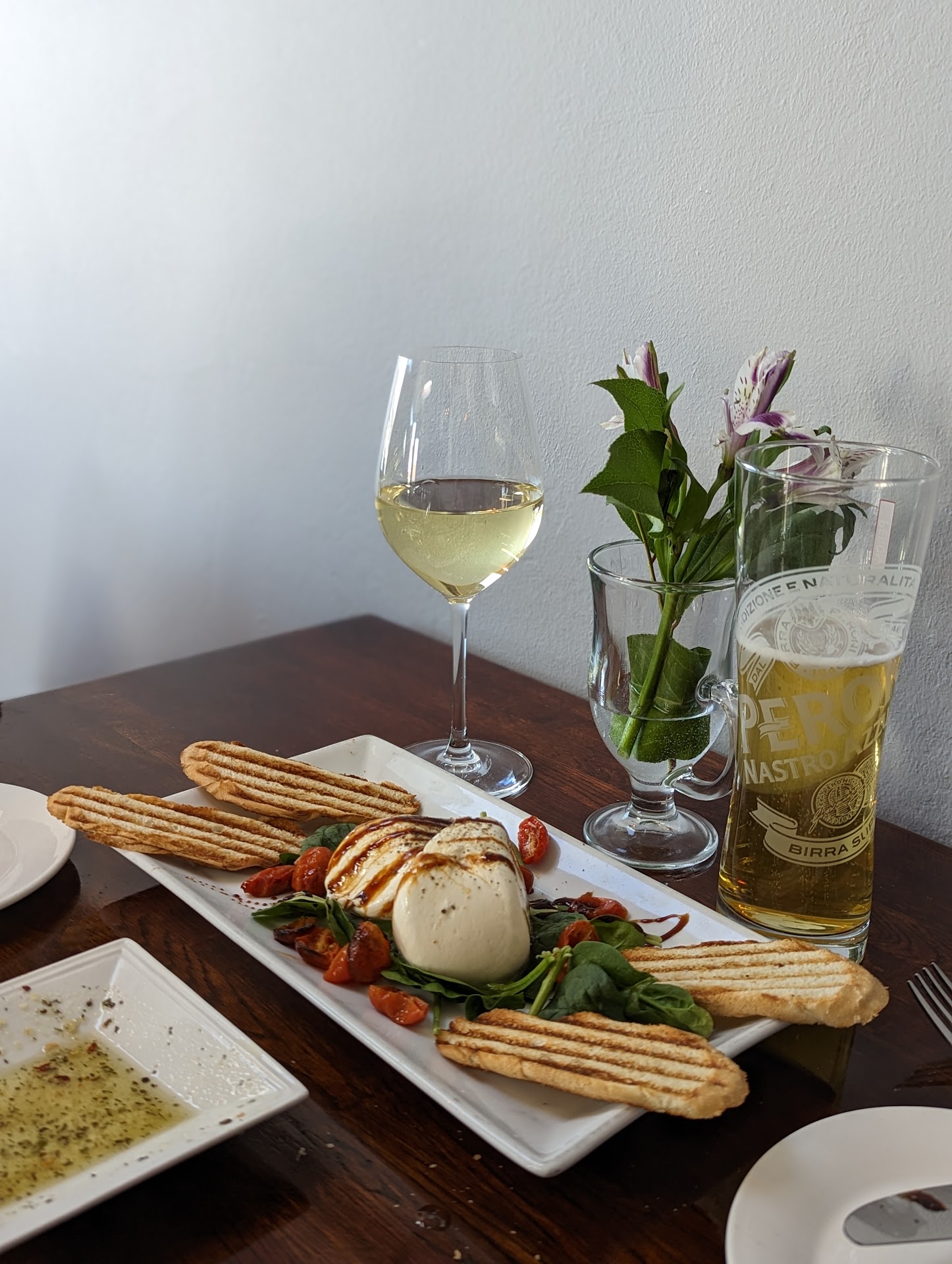 We started off with the Italian pale lager Peroni. I don't often drink Italian beer, but when I do it's Peroni! Served appropriately chilled in accommodating pilsner. Others would follow. At Bug's recommendation we also tried the Soave wine. Soave is a dry white Italian wine from the Veneto region in northeast Italy, principally around the city of Verona. It was wonderful! I wish we would have got the info on the winery. They did not skimp on the pour, and I noticed the other guests benedited from very nice pours as well. A heavy hand on the wine bottle is always appreciated! Fresh, warm bread was delivered with the drinks. The obligatory "Italian butter" joined along, but this was not the Parm ladden typical stuff. It was light and smooth OO with a touch of Italian spice laced through. It was perfect!