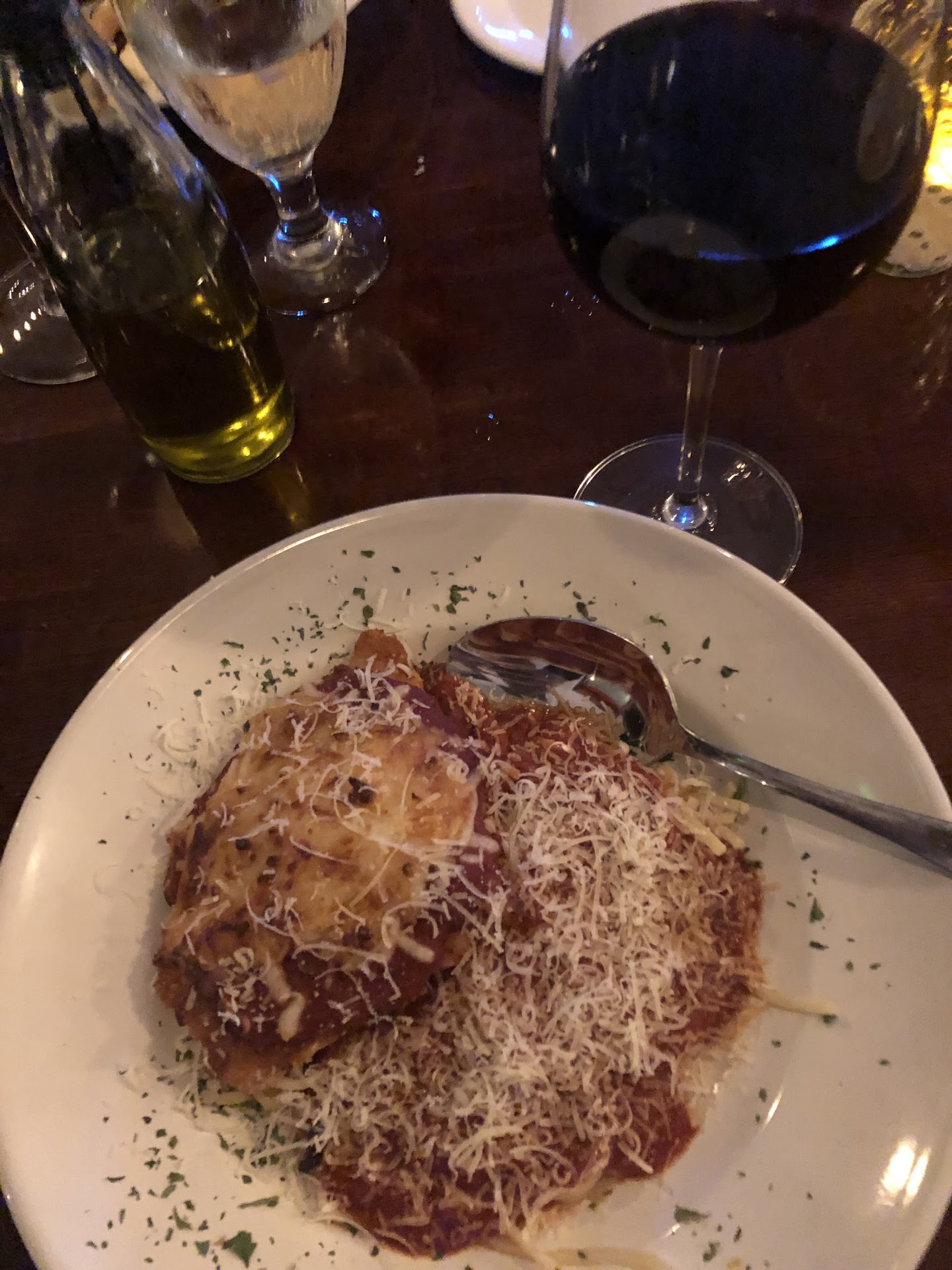 Read moreRecommended by a friend and glad we dined there. We found out they had just reopened about a week ago after being closed for a couple of years so I'm sure they're still working some kinks out but we were quite satisfied and would love to go back. We started with the bruschetta (pic) which was a perfect start to our meal even after the bread, herbs and oil that had already been provided. For our entrees she had the chicken parmigiana (pic) and I had the linguini with clams (pic) and we each got the house salad. If I had to pick on something we thought they went a little too far down the base of the romaine for our taste but that's probably being a little picky. I'm glad I had two pieces of bread left over from what was served prior to our meal. Good for getting every drop from my dish. We agreed that we were both quite pleased with that course. Finally, I had a raspberry sorbet and we shared a chocolate and cherry bread pudding (pic is missing a couple bites, we couldn't wait) that was served as a huge portion and quite frankly, the best either of us had ever had. We also thought that the price for the meal was quite reasonable at $76.15 including tax before tip. Service throughout our experience was excellent. Actually wish I could give a 4.5 star rating but I have to...